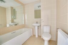 BATHROOM – White suite incorporating bath with shower attachment, pedestal wash hand basin with mixer tap, W/C, part tiled walls, tiled floor, wall mounted toilet roll holder, wall mounted mirror.