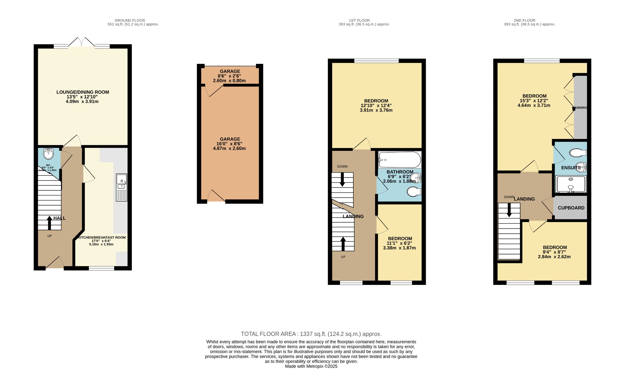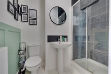 Tile flooring with contrasting tiled splash backs, shower cubicle, wash basin and toilet.