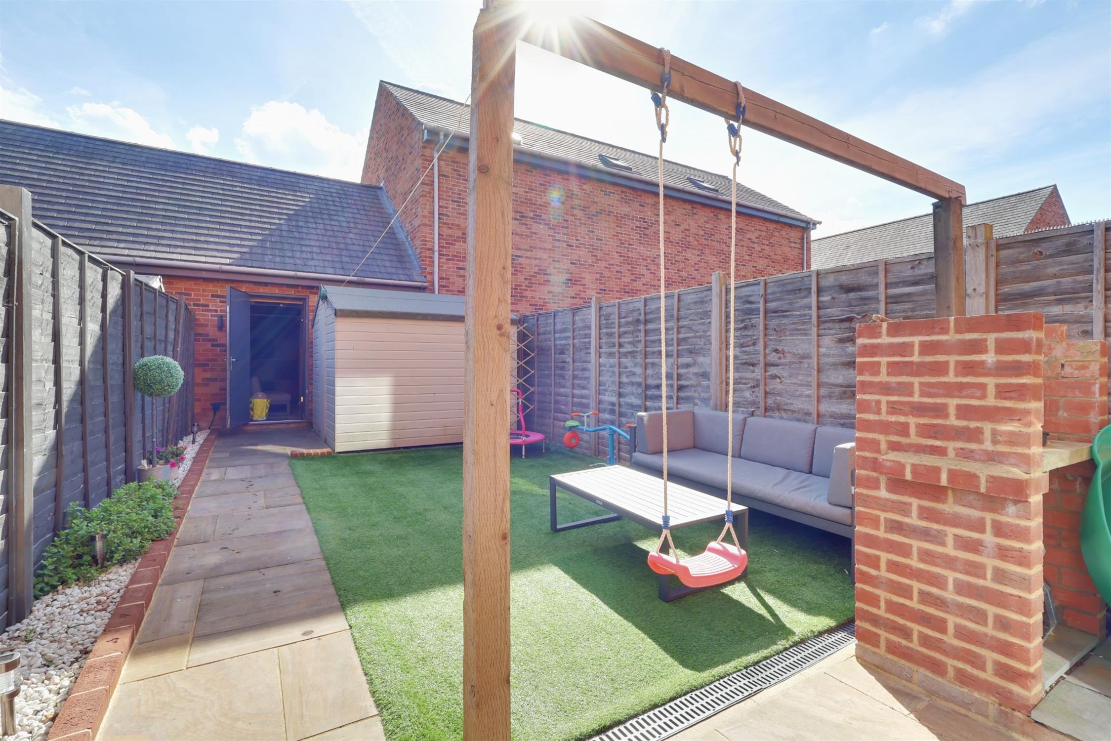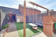 Mostly laid to artificial lawn with brick and stoned borders. Paved patio, enclosed by panel fences, with access into the converted garage.