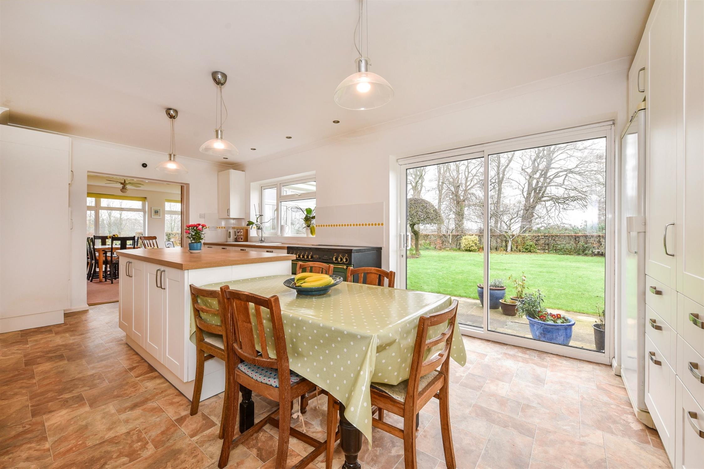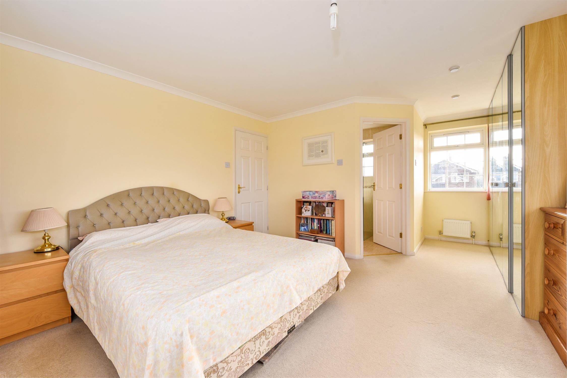 Upstairs, there are five bedrooms. When you enter the master bedroom, you are struck by the panoramic views afforded by the windows on two corner aspects. The room is particularly large and there is a modern ensuite which is fitted with a walk-in shower, bath, toilet, and handbasin. There is a bank of wardrobes and also spacious eaves storage. The remaining bedrooms are all doubles, and the two to the rear of the house offer similarly impressive far-reaching views. The family bathroom can be found on the first floor. This is a white suite and is fitted with a shower over bath, toilet, handbasin, and a storage cupboard. There is also a storage cupboard on the landing.