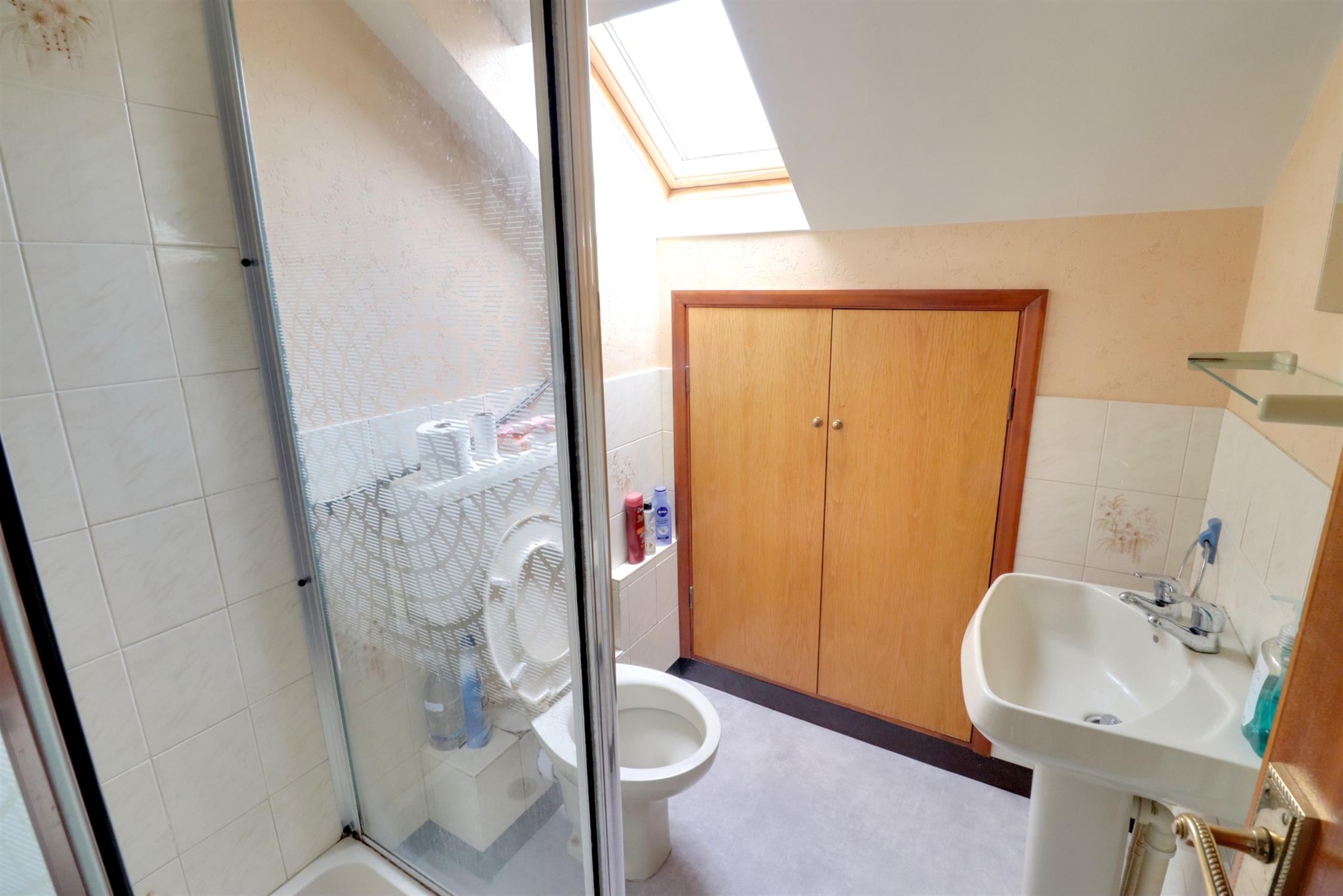 ‘Velux’ style roof window, pedestal hand basin, WC, tiled shower cubicle, radiator, slatted shelved airing cupboard housing immersion heater.