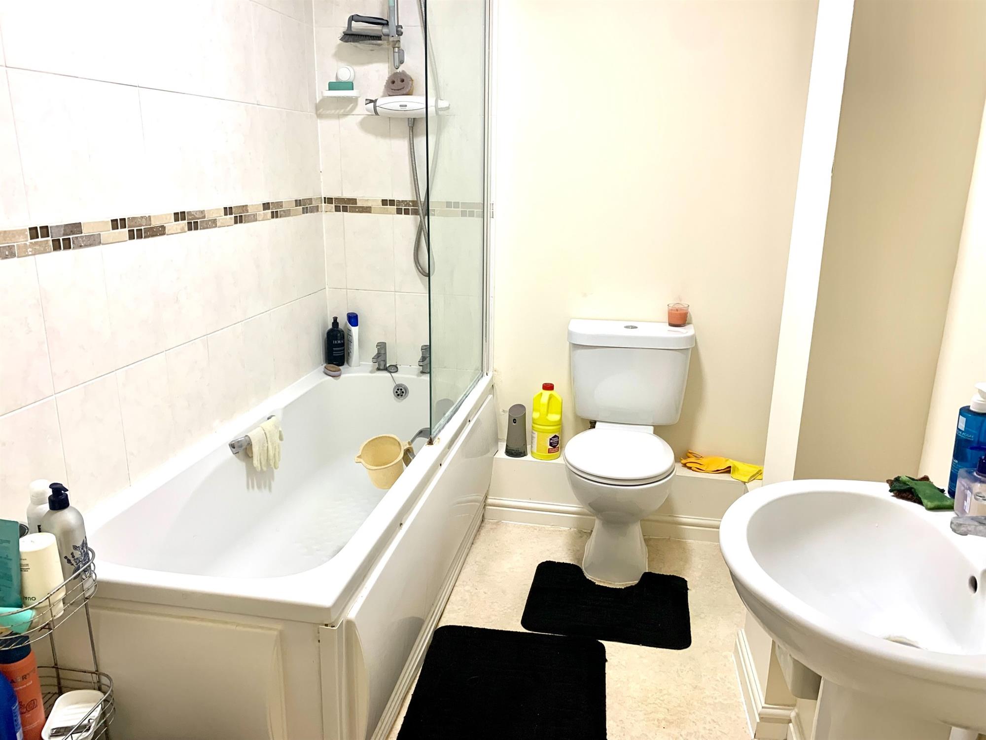 BATHROOM – White suite which consists of bath with shower over, sink and toilet.