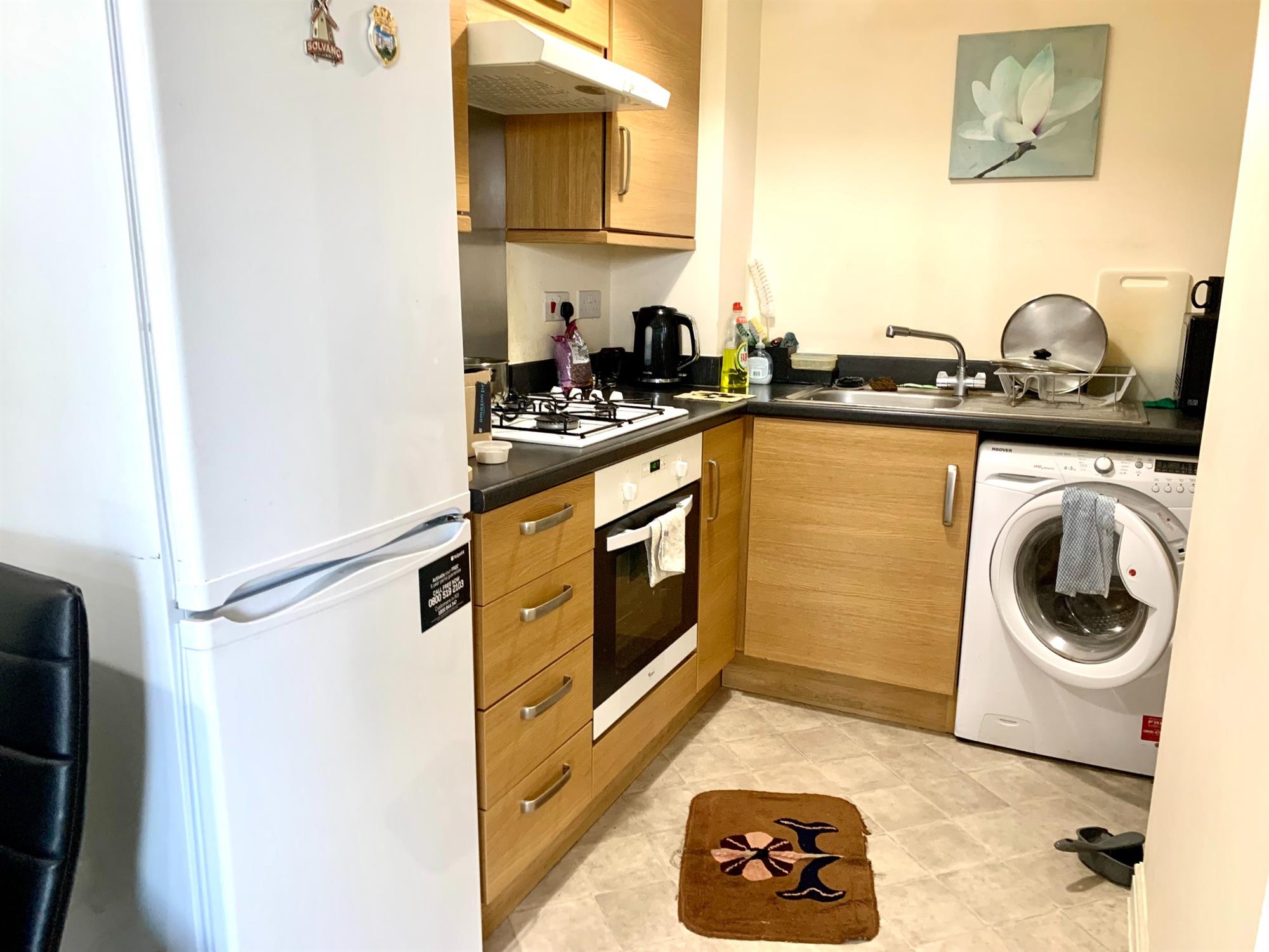 KITCHEN – Modern wall and base units. Appliances consist of: gas hob, electric oven, fridge/freezer and washer/dryer.