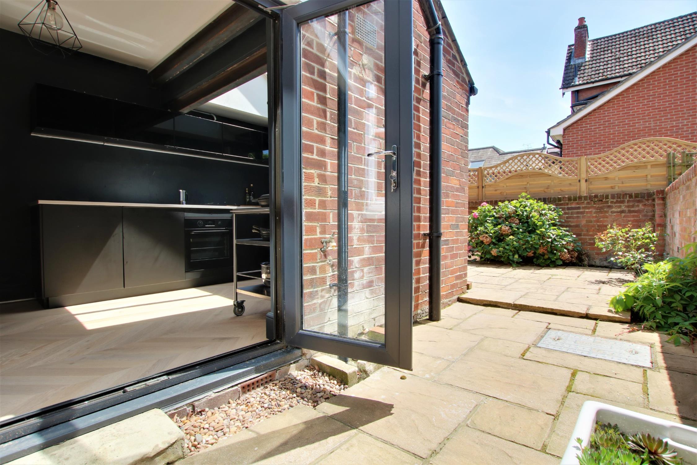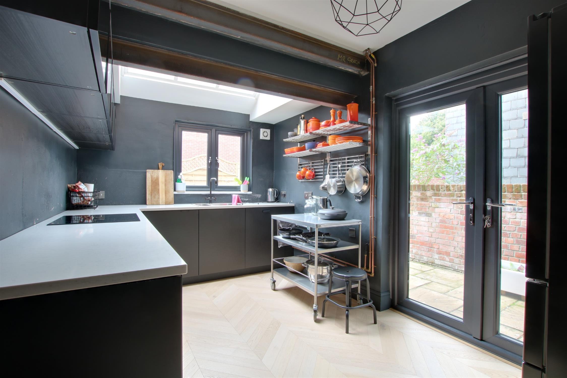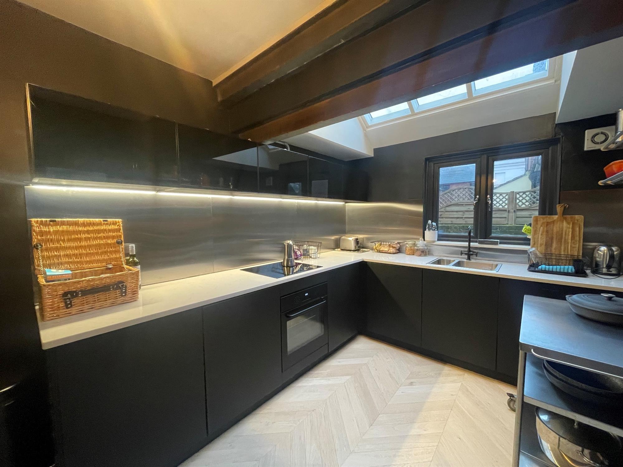 Quartz worktop. Matt black base units with gloss black wall units over. Oven, induction hob, Integrated dishwasher, American style fridge/freezer, washing machine, inset sink. Double glazed window to rear. Double glazed patio doors to rear garden. Smooth walls and ceiling.