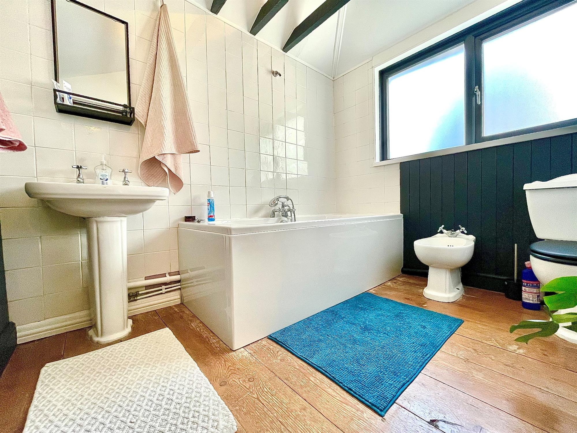 Exposed floorboards. Smooth walls and ceiling. Painted wood panelling. Panelled bath with mixer tap shower over, ceramic wash basin , bidet and w.c. Radiator. Obscure double glazed window to side.