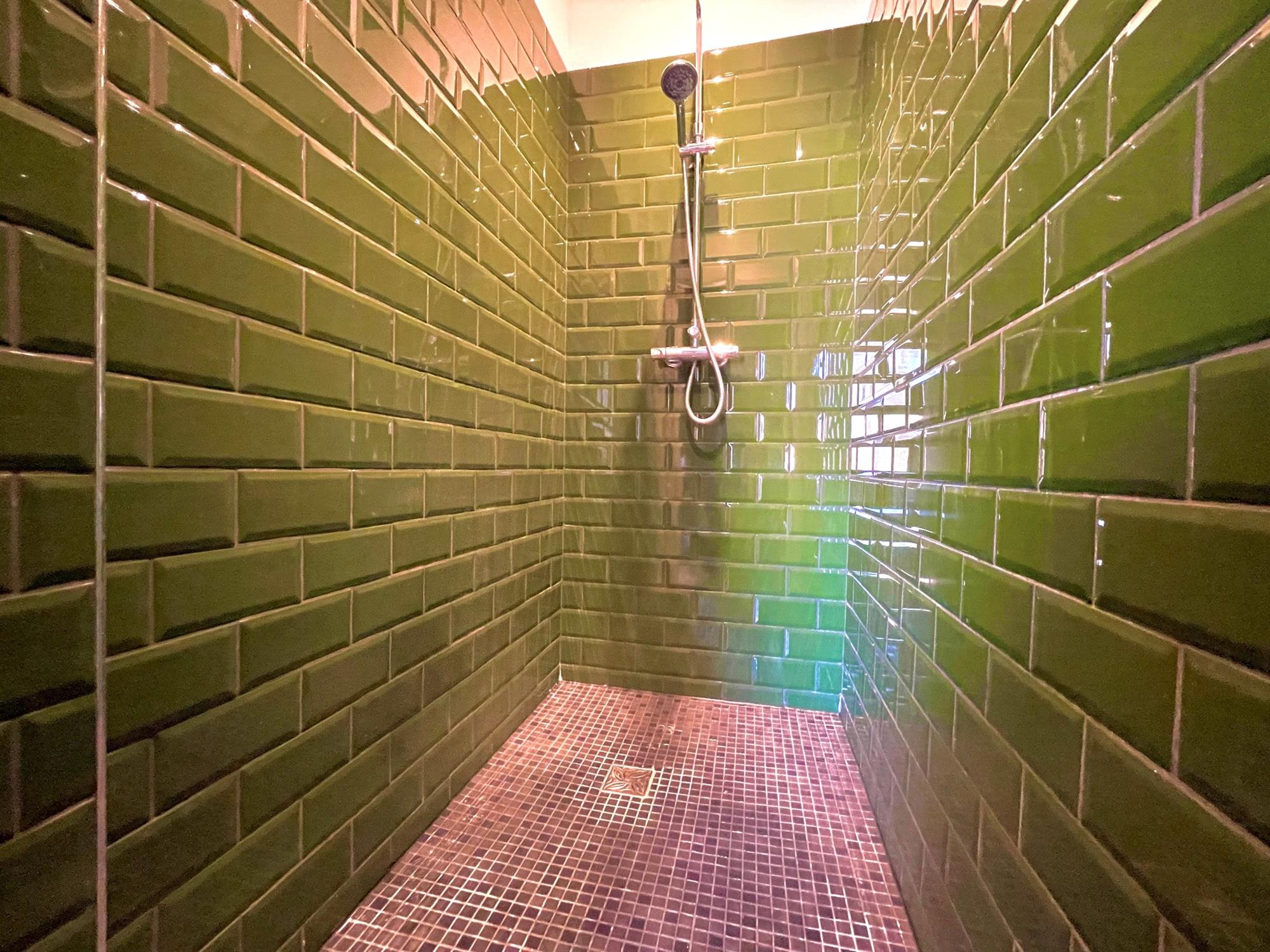 Contrasting wall and floor tiling. Bar valve rainfall shower unit. Extractor fan.