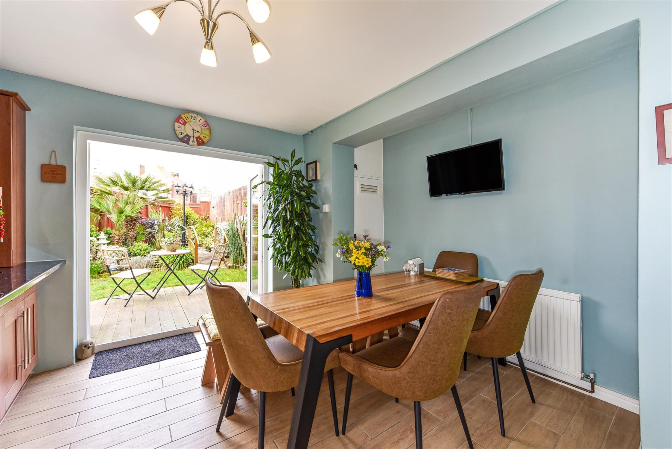 Smooth ceiling, double glazed double doors to rear garden, double glazed window to side aspect, walk in pantry cupboard, storage cupboard, kitchen comprising a range of wall and base mounted units with work surfaces over, inset stainless steel sink and drainer with mixer tap over, integrated appliances including: electric oven and microwave, induction hob with extractor fan over, and dishwasher, space for fridge freezer, radiator, wood effect flooring.