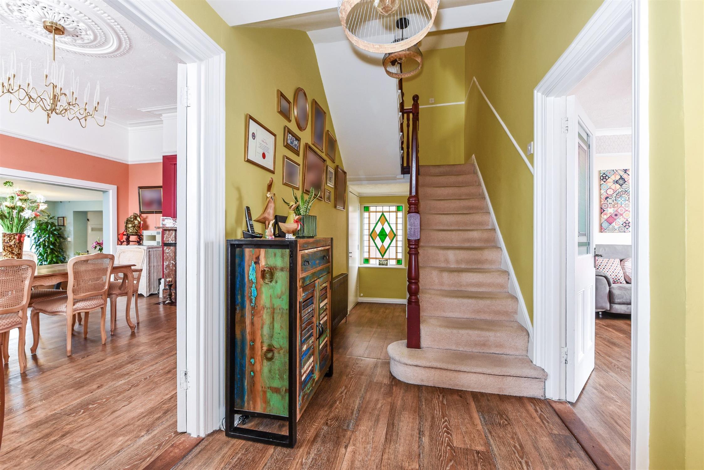 Smooth ceiling, stained glass window, storage cupboard, column radiator, carpeted stairs to first floor, wood effect flooring.