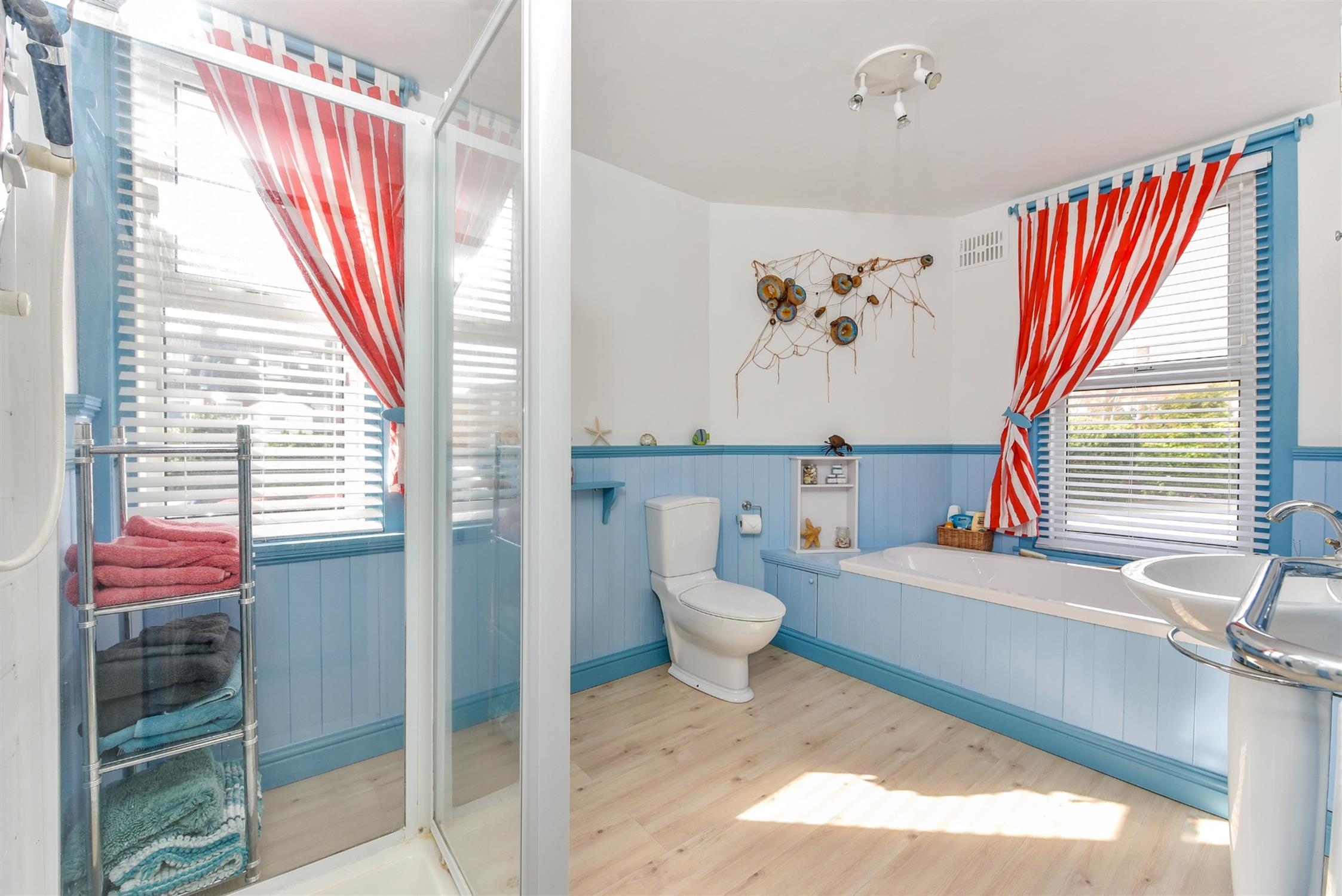 Smooth ceiling, double glazed obscured window, shower cubicle, WC, pedestal wash hand basin, towel radiator.
