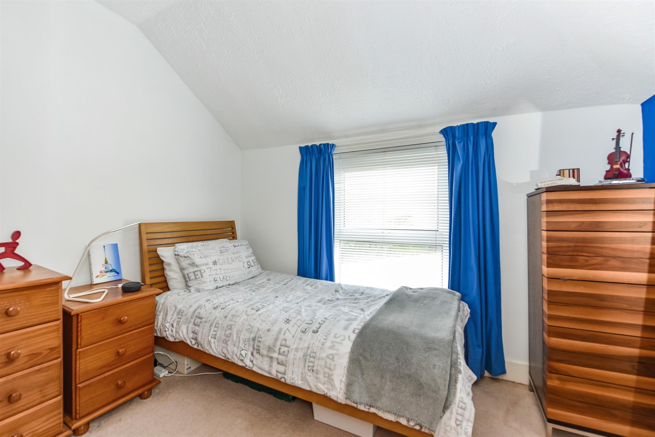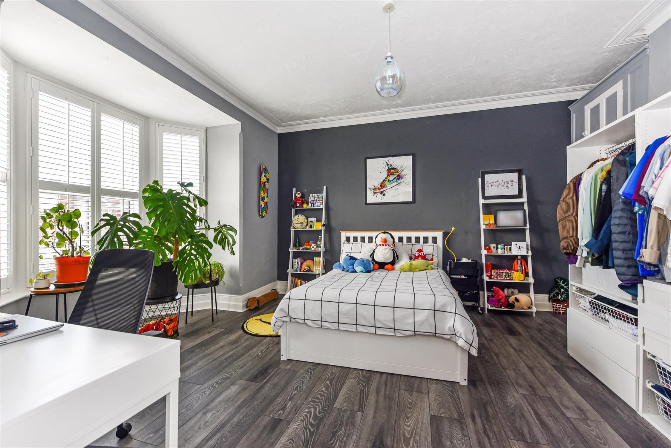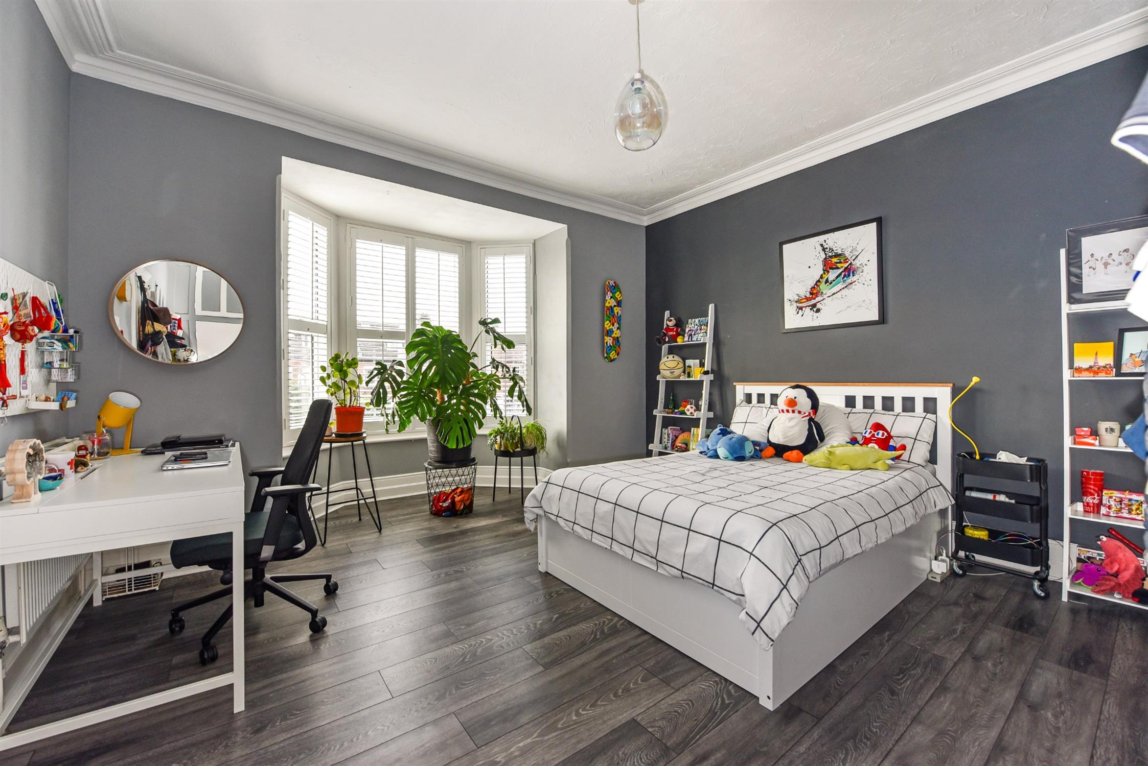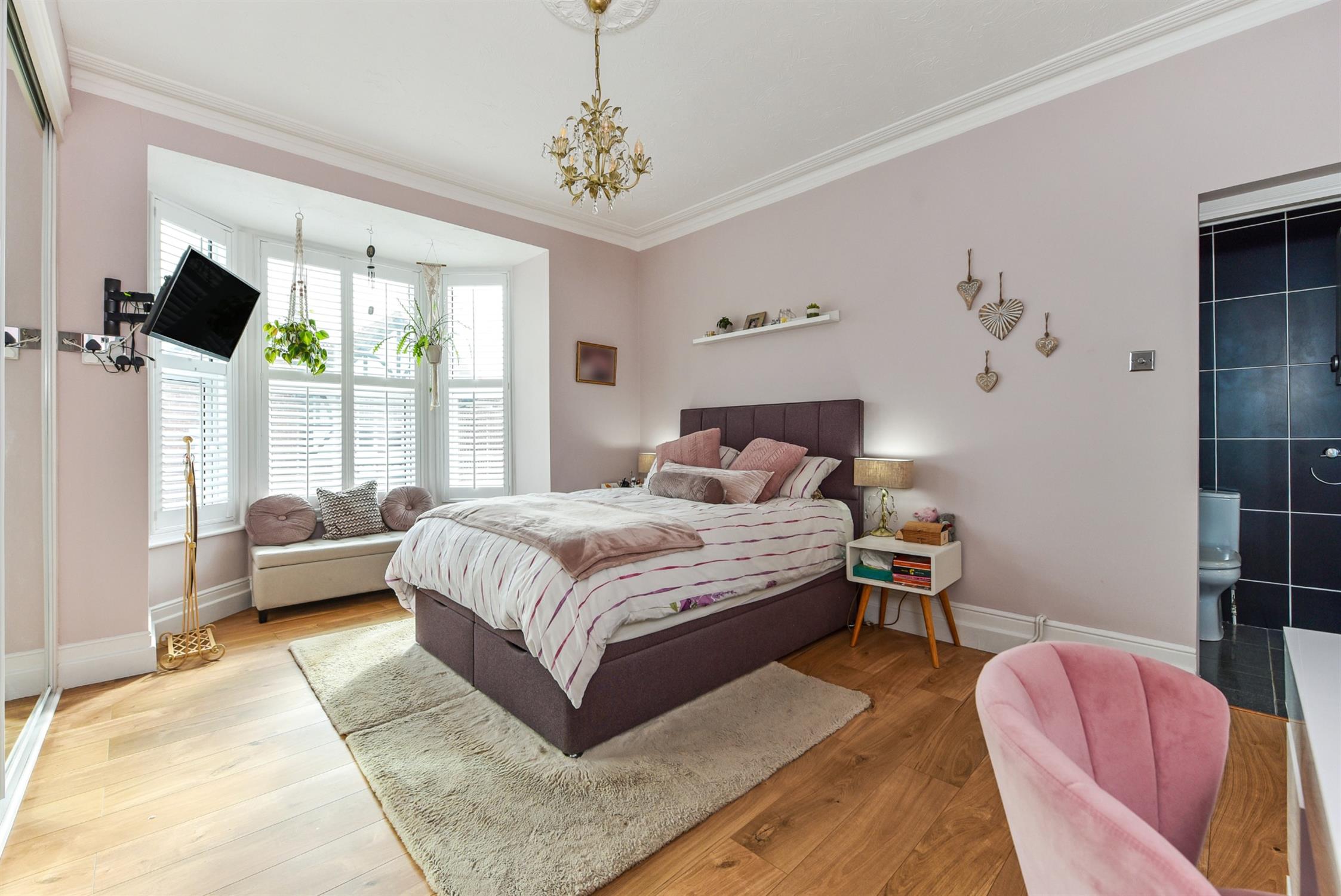 Textured ceiling, ornate cornicing, double glazed bay windows to side aspect with fitted shutters, fitted wardrobes, radiator, wood effect flooring.