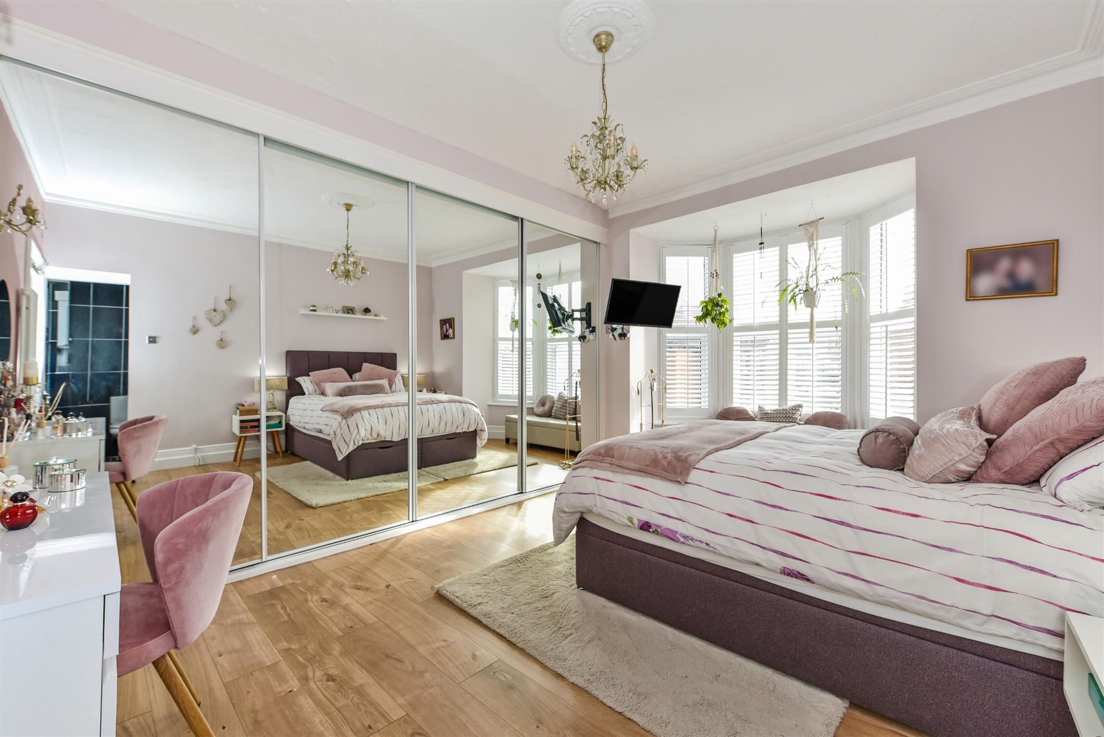 Textured ceiling, ornate cornicing, ceiling rose, double glazed bay windows with fitted shutters, full run of fitted mirror door wardrobes, tall column radiator, wood effect flooring.