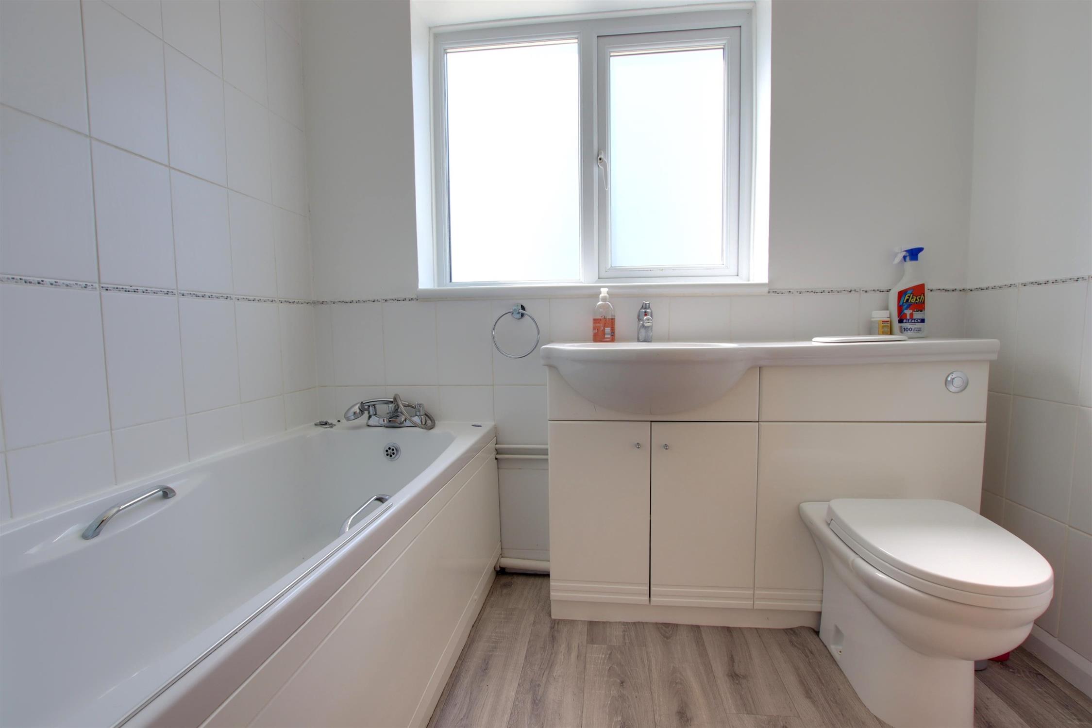 Double glazed obscure window to the rear aspect. Smooth ceiling with inset spotlighting. Extractor fan. Bath with electric shower above and screen, wash hand basin and concealed low level WC. Heated towel rail. Part tiled walls. Vinyl flooring.