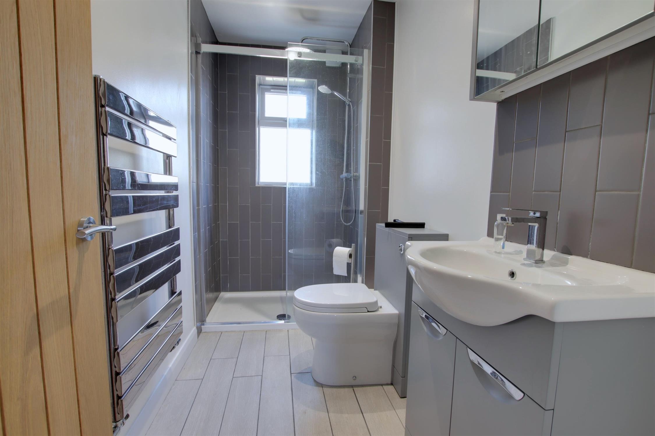 Double glazed obscure window to the rear aspect. Smooth ceiling with inset spotlighting. Modern suite comprising walk-in shower cubicle with glass screen, concealed low level WC and wash hand basin. Heated towel rail. Part tiled walls. Tiled flooring.