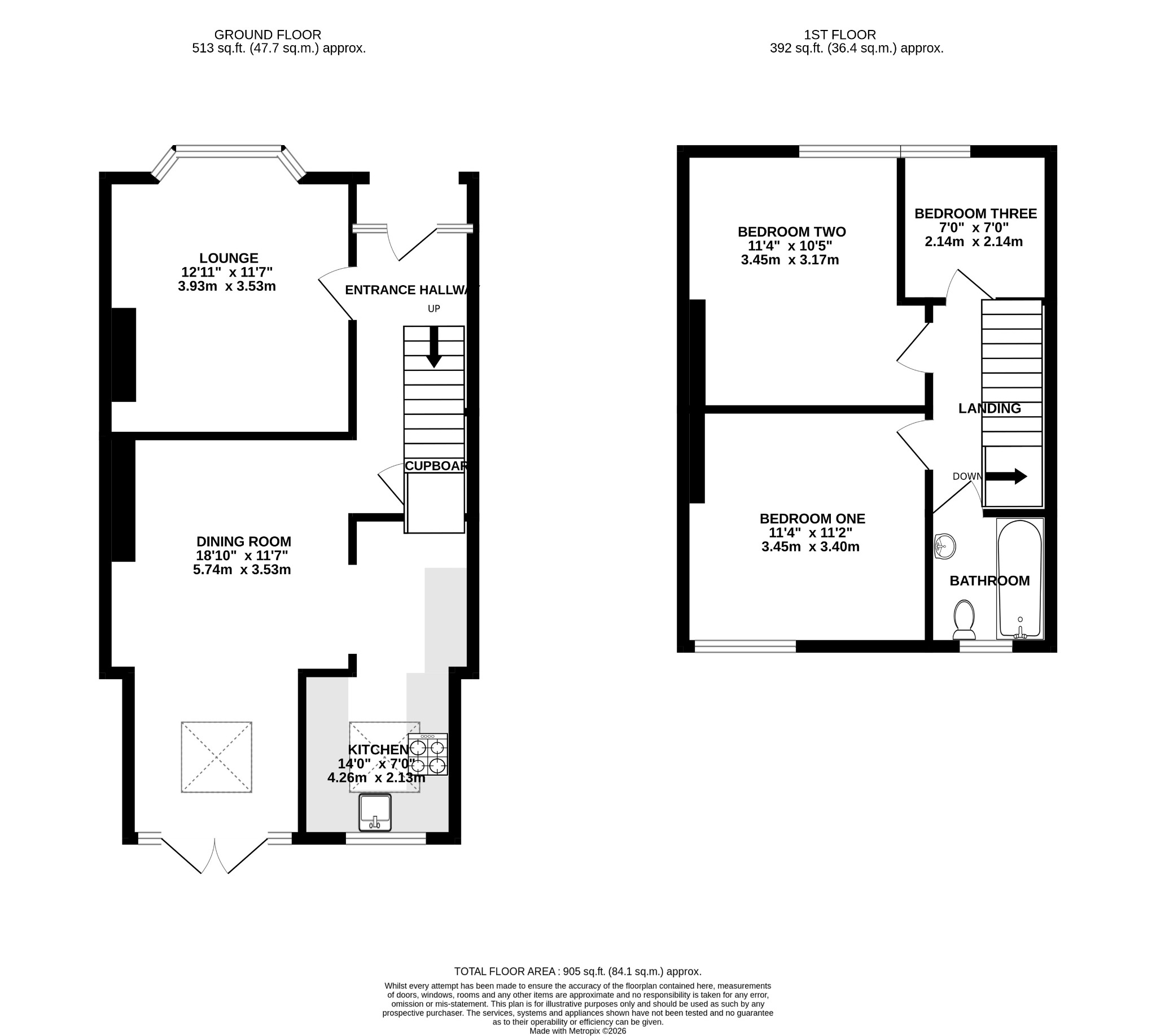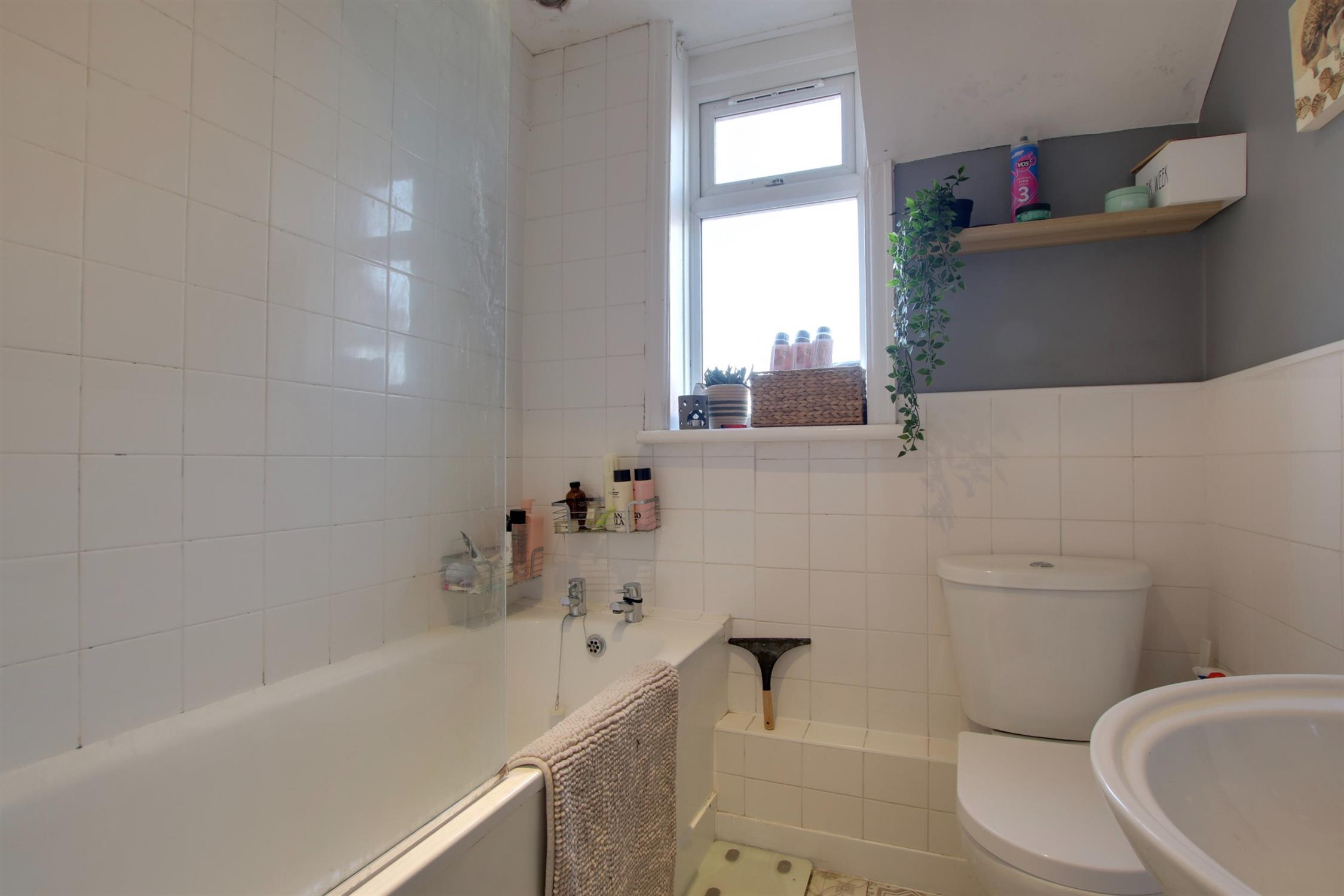 Double glazed obscure window to the rear aspect. Smooth ceiling with extractor fan. Suite comprising bath with shower over and screen. Low level WC. Wash hand basin. Part tiled walls. Tiled flooring.