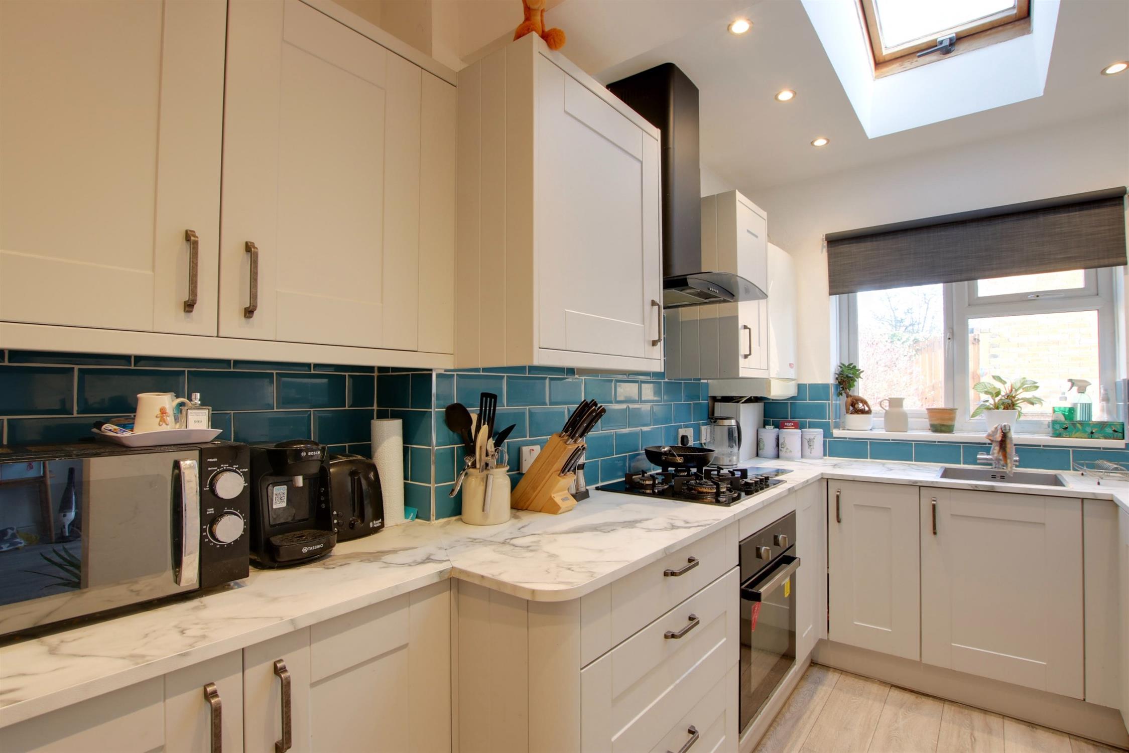 Double glazed window to the rear aspect. Part vaulted ceiling with double glazed skylight. Smooth ceiling with inset spotlighting. Modern re-fitted kitchen with matching wall and base units with marble effect worktops. Inset stainless steel sink. Integral fitted oven/grill. Four ring gas hob with extractor hood above. Space for fridge/freezer. Additional integrated appliances include slimline dishwasher and washer/dryer. Continuation of the flooring from the living room.