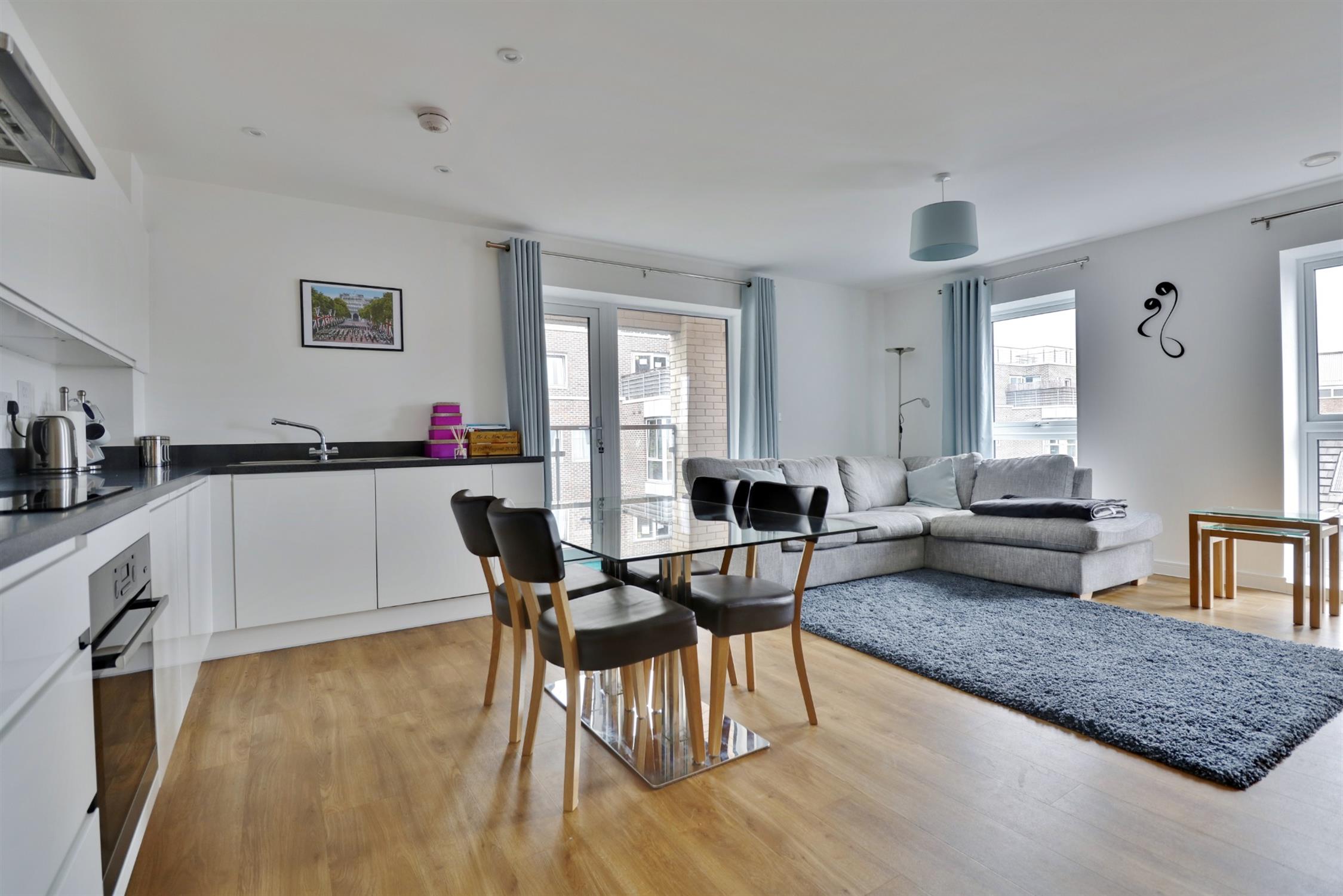 Open plan living/ dining area. Doors to balcony.