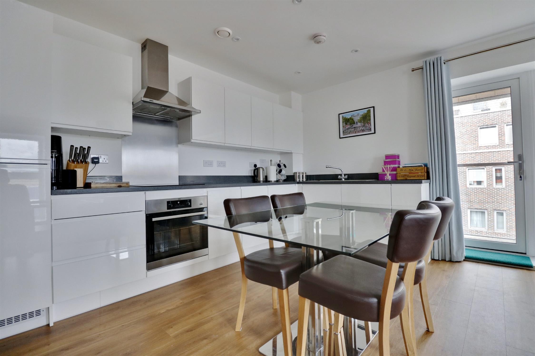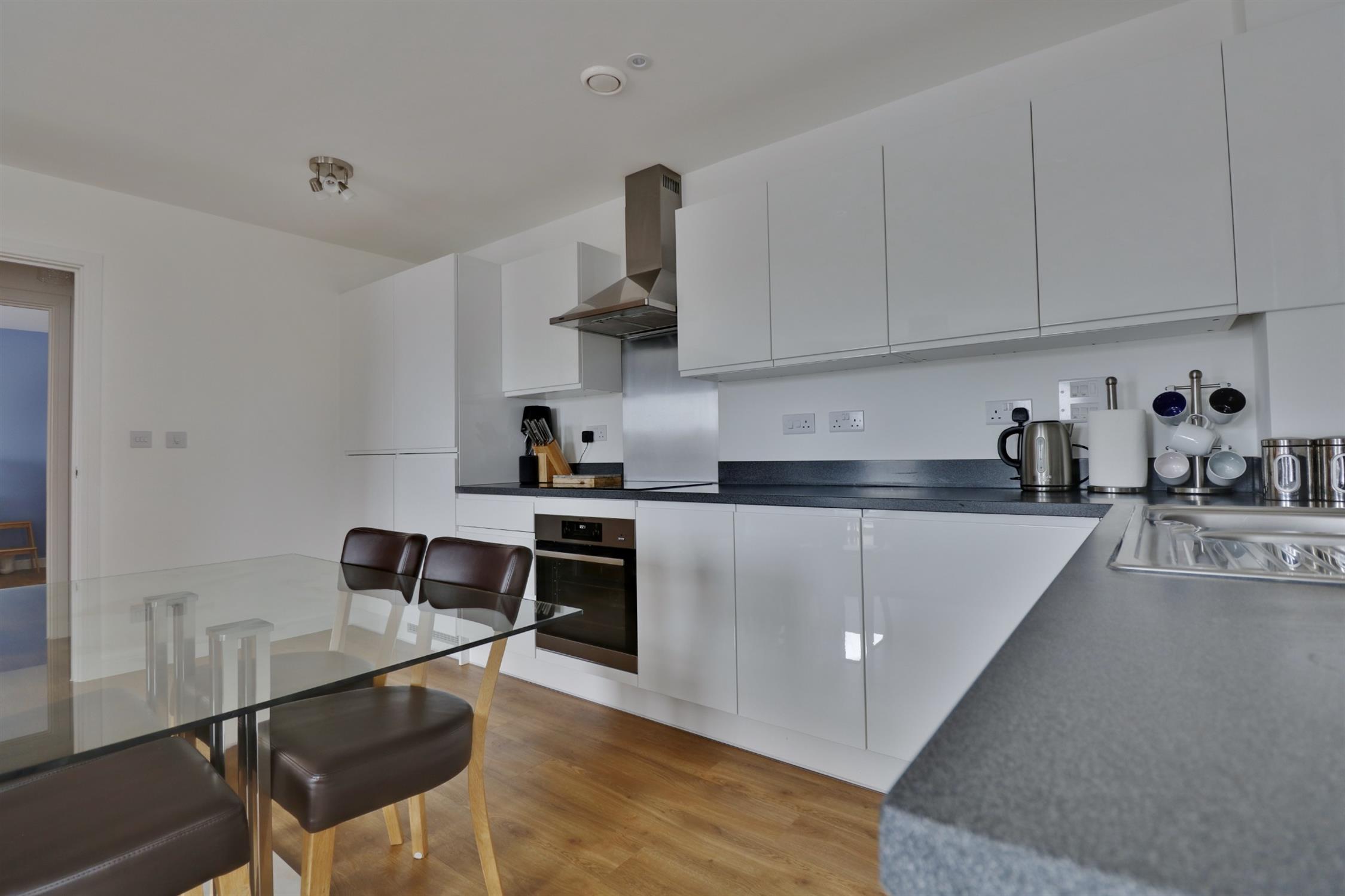 Modern white fitted kitchen with built-in fridge/ freezer, washing machine & dishwasher. Electric oven & induction hob.