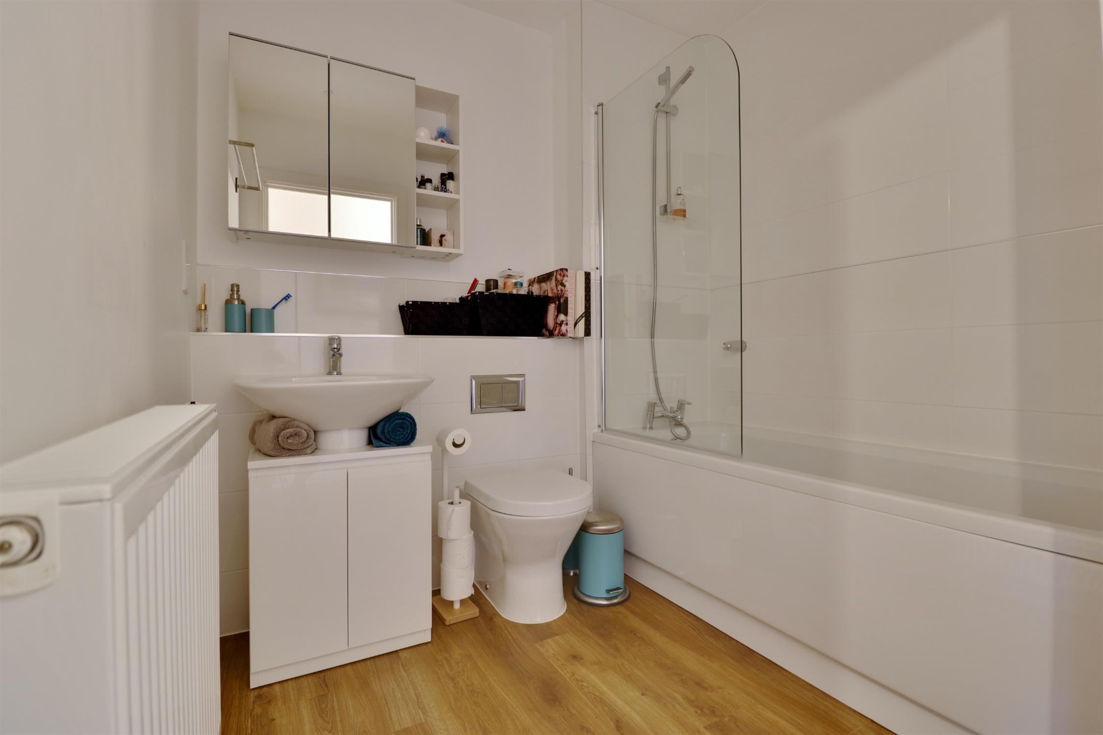 Modern bathroom with shower over bath, w.c & basin.