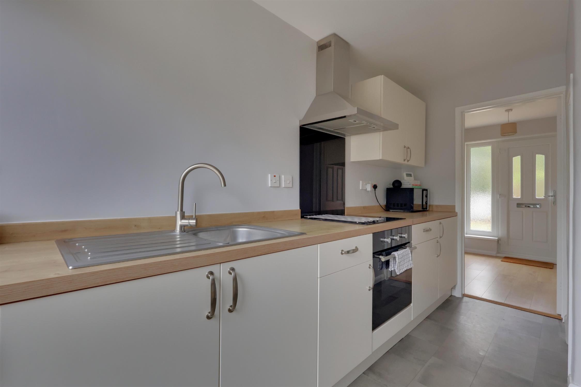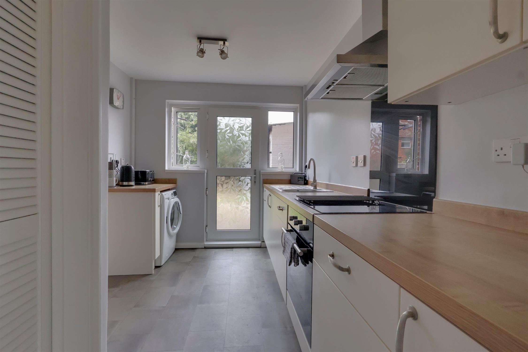 A range of wall and base cupboards with work surface over. Four ring electric hob with extractor fan over. Integrated oven. Stainless steel sink with drainer. Plumbing for washing machine. Store cupboard. Double glazed windows and a door to the rear garden.