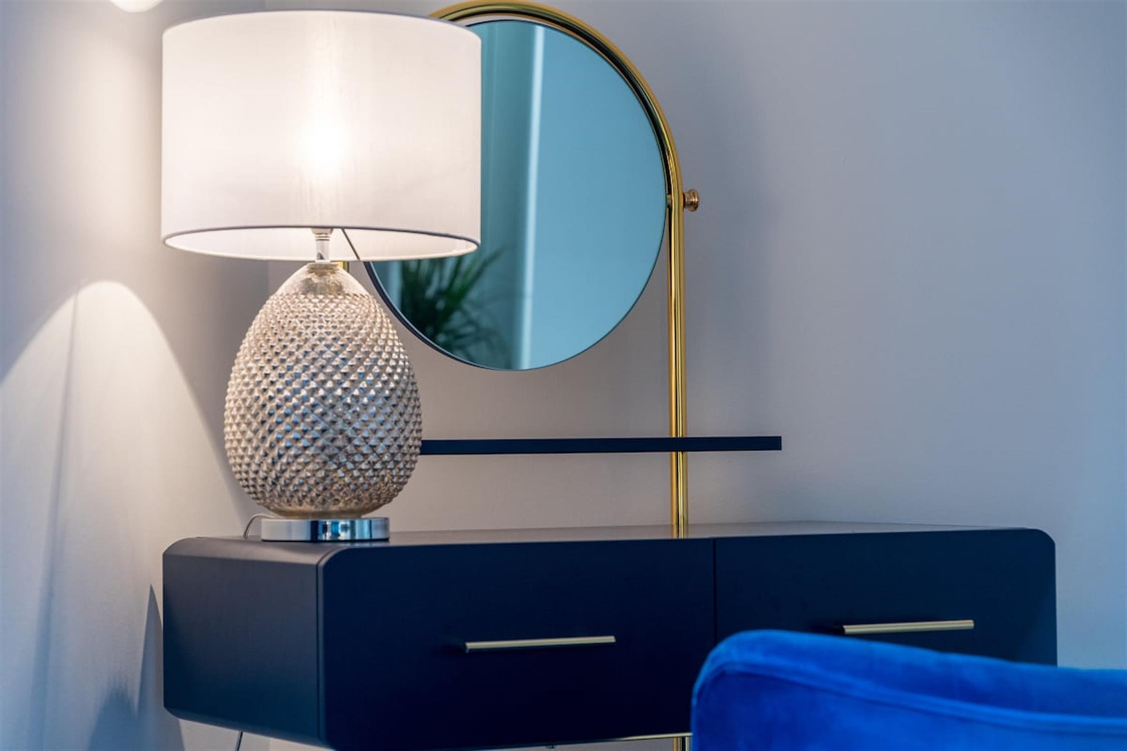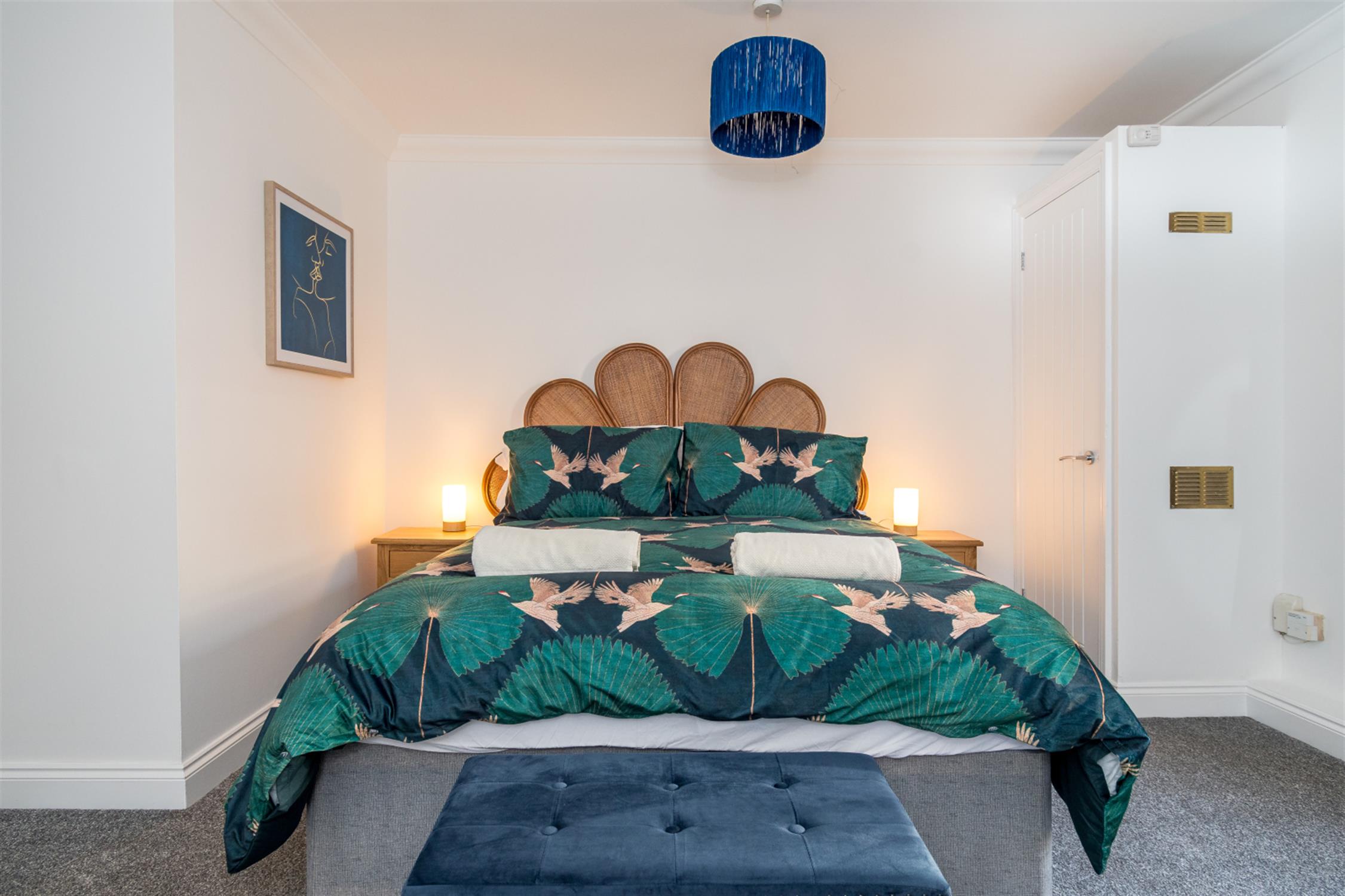 The flat has one large bedroom featuring a king-size bed, bedside drawers, a wardrobe, and a stylish dressing table.