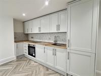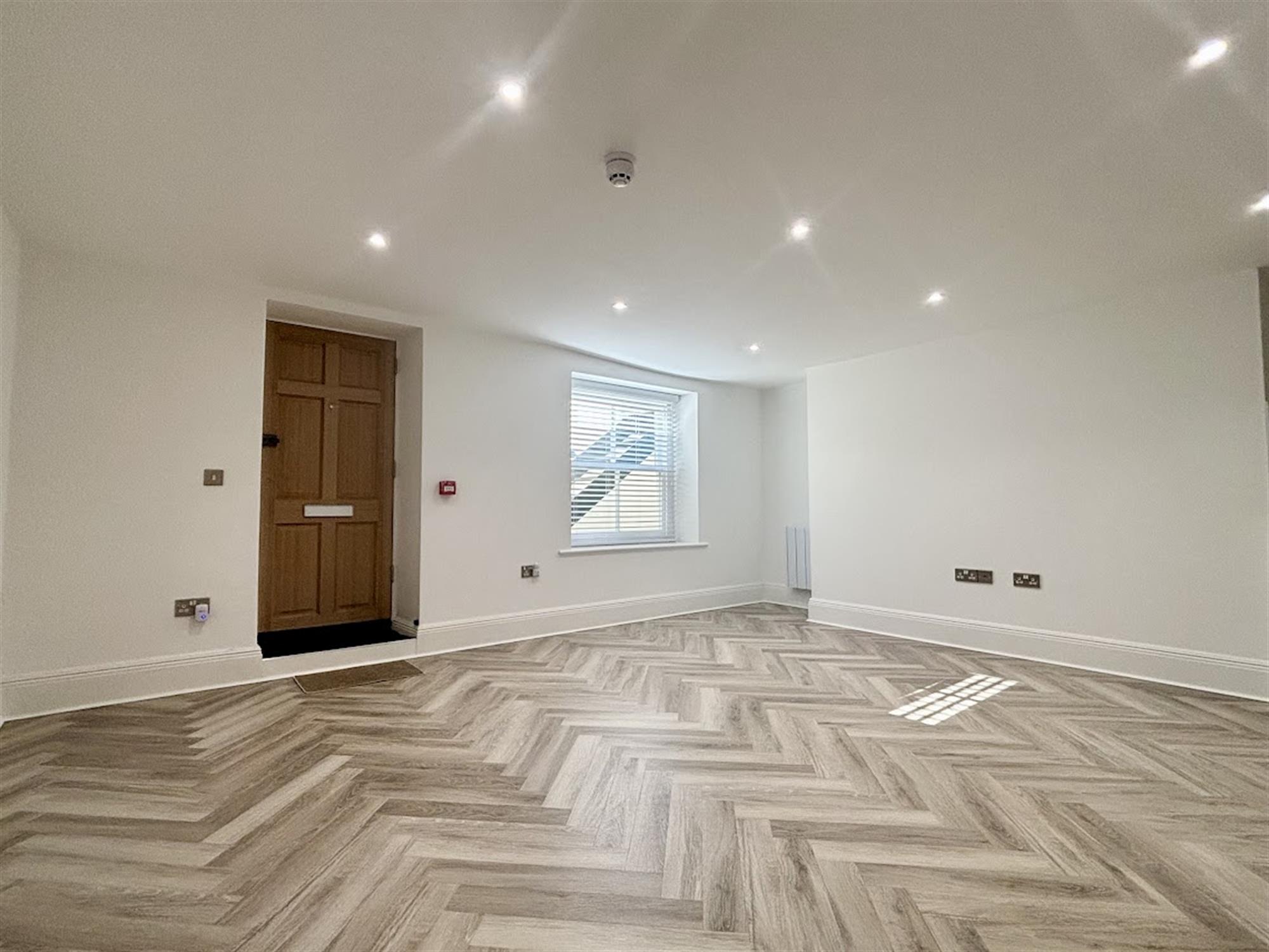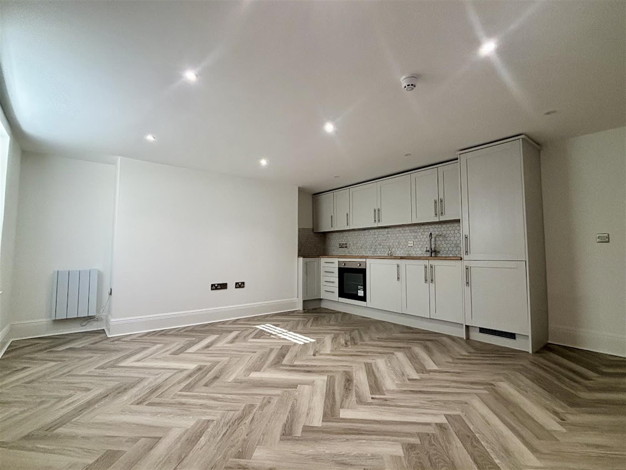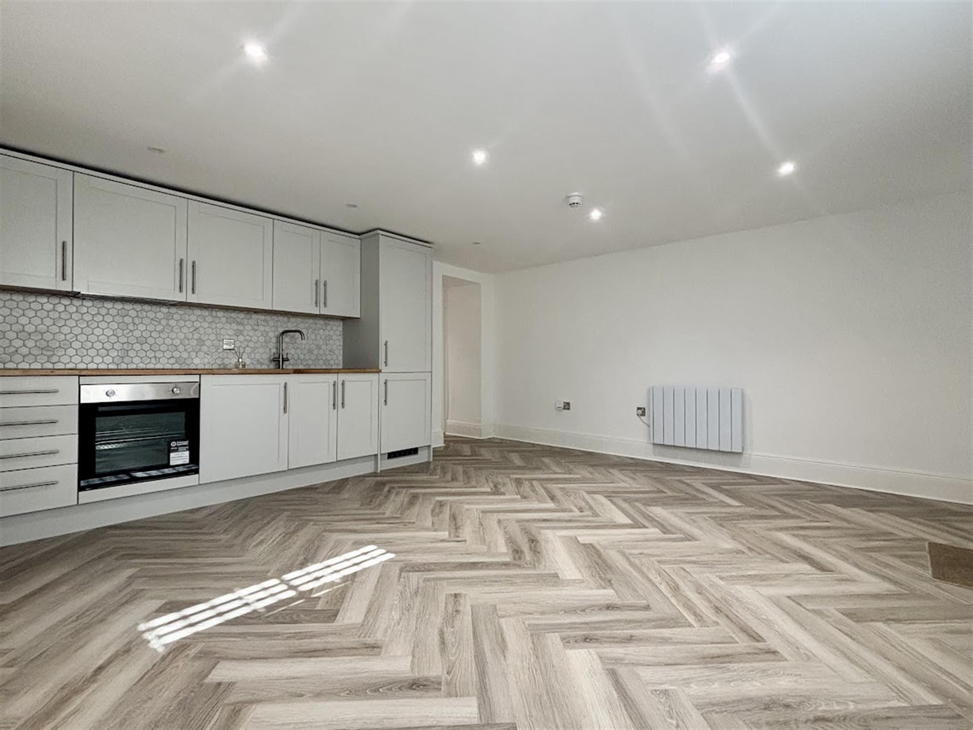 Open plan lounge/kitchen with laminate flooring and a window to the front. The kitchen comes with integrated appliances including a washer/dryer, fridge/freezer and an electric oven and hob.