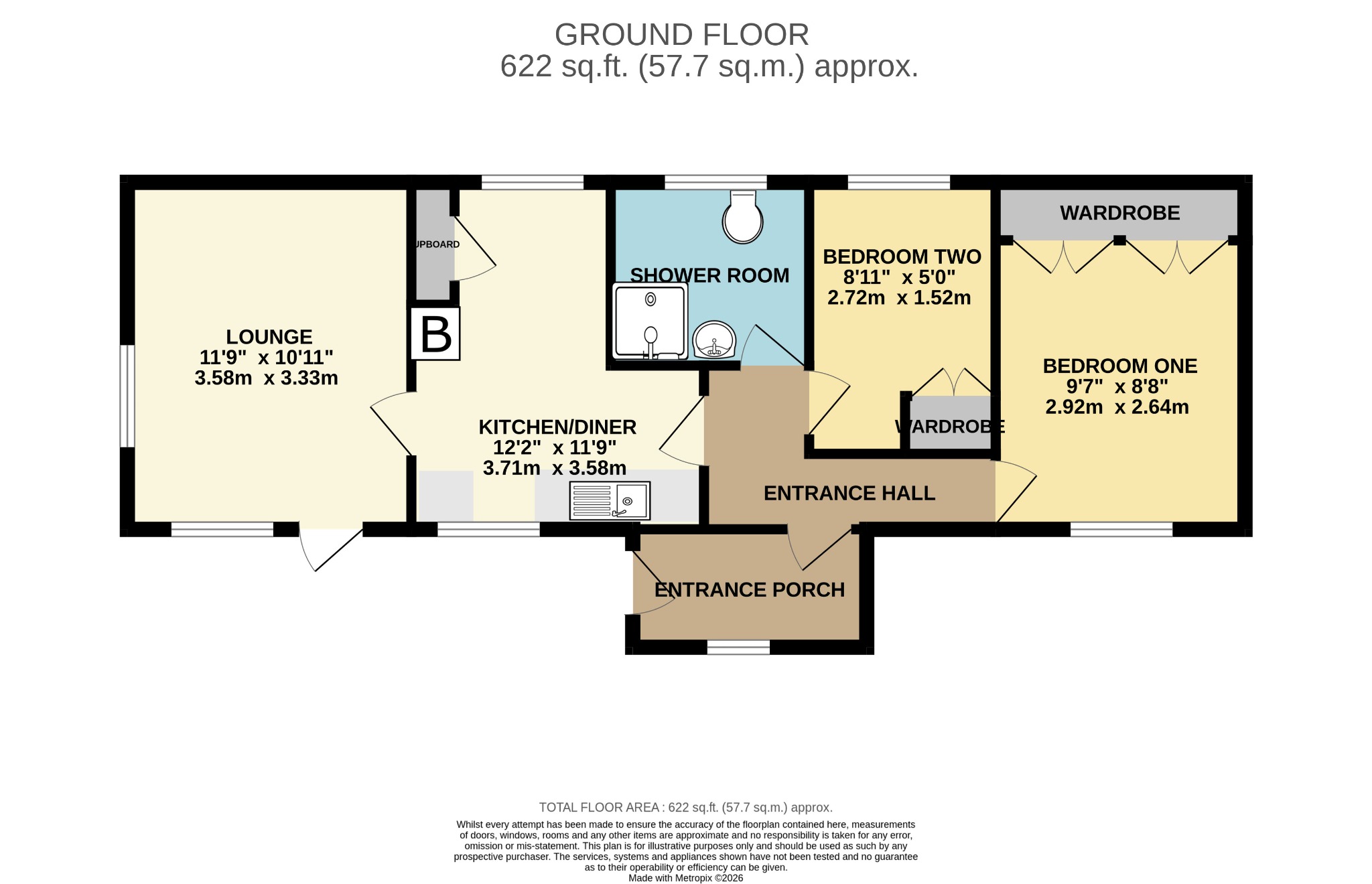 Step in shower cubicle with electric shower. Low level WC. Pedestal wash basin. Radiator. Obscured double glazed window.