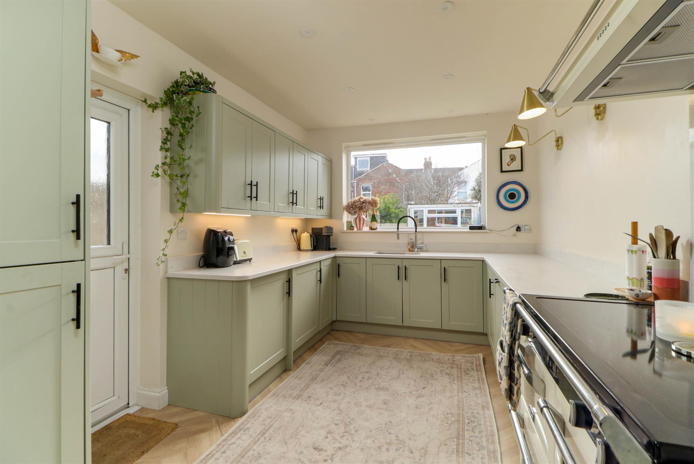 Smooth ceiling, inset spotlights, dual aspect UPVC double glazed windows, double glazed door to rear garden, range of wall and base mounted units with Quartz work surfaces and upstands, inset stainless steel sink unit and routed drainer with mixer tap over, space for range style cooker, integrated fridge freezer, integrated dishwasher, space and plumbing for washing machine and tumble dryer, LVT flooring.