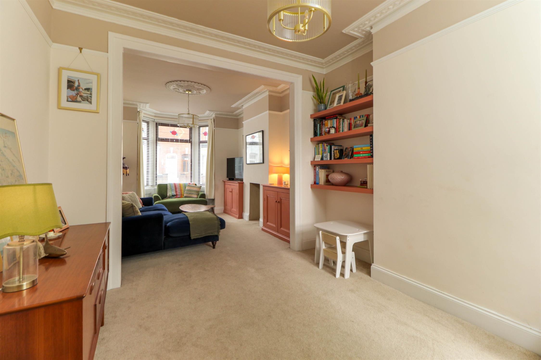 Smooth ceiling, ornate cornicing, ceiling rose, picture rails, recessed shelving, UPVC double glazed window, radiator, fitted carpet.