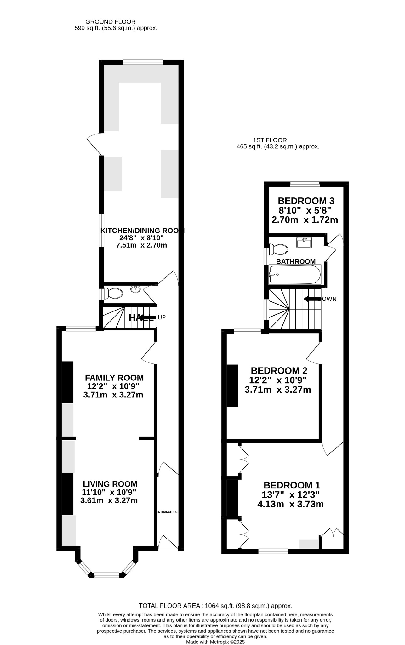 A convenient downstairs cloakroom completes the ground floor accommodation. Upstairs, there are two well-proportioned double bedrooms and a third smaller room ideal as a nursery, study, or dressing room. The modern family bathroom offers a stylish and tranquil space with quality fittings throughout. To the rear, a delightful south-facing garden provides a private and sunny retreat with lawn, patio and a brick built storage shed.