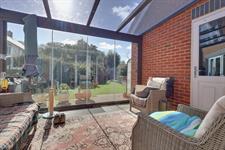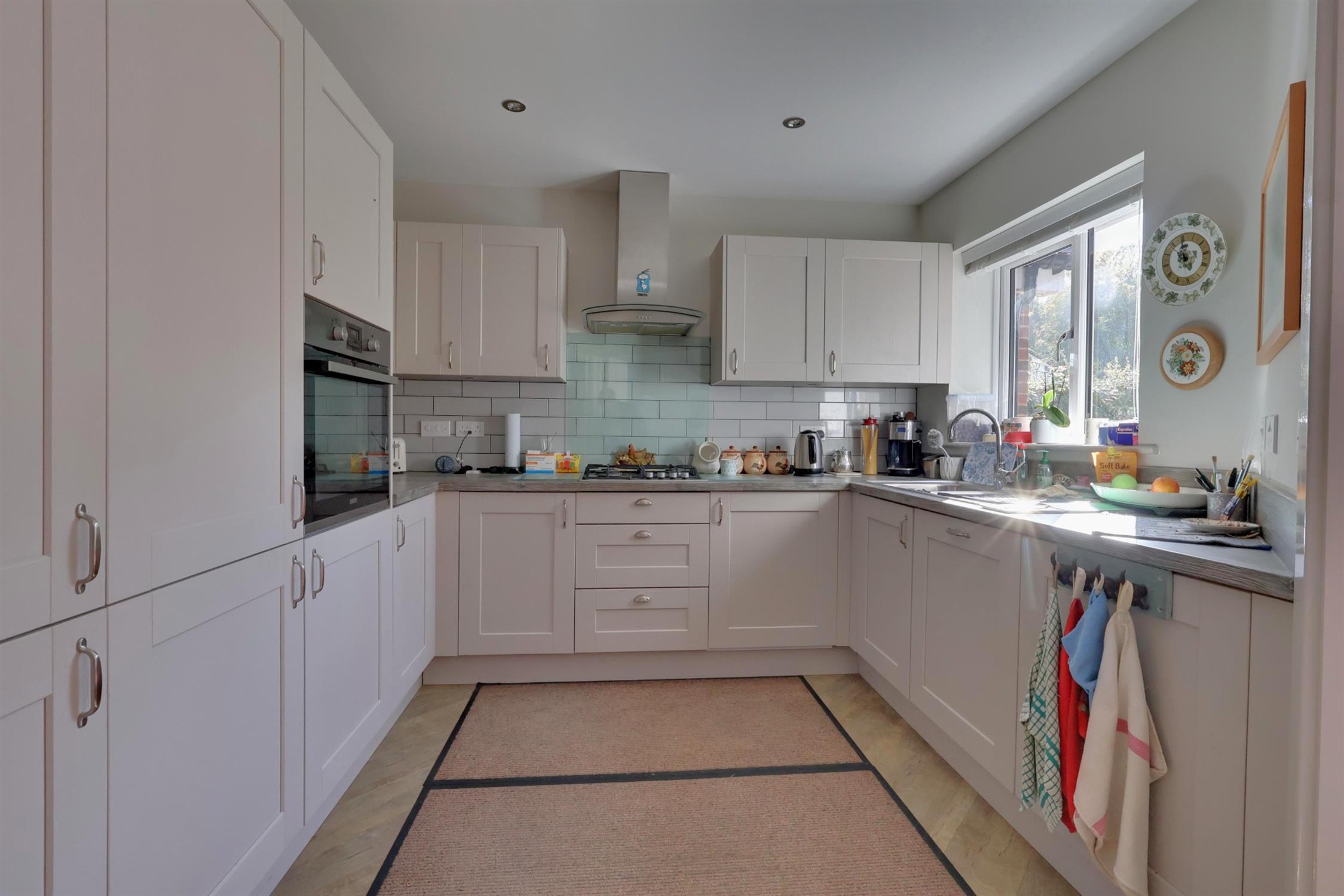 A range of wall and base cupboards with work surface over. Four ring gas oven with extractor fan over. Integrated oven, fridge freezer, washing machine and dishwasher. Inset one and a half stainless steel sink with drainer. Double glazed window. Bi-fold doors to: