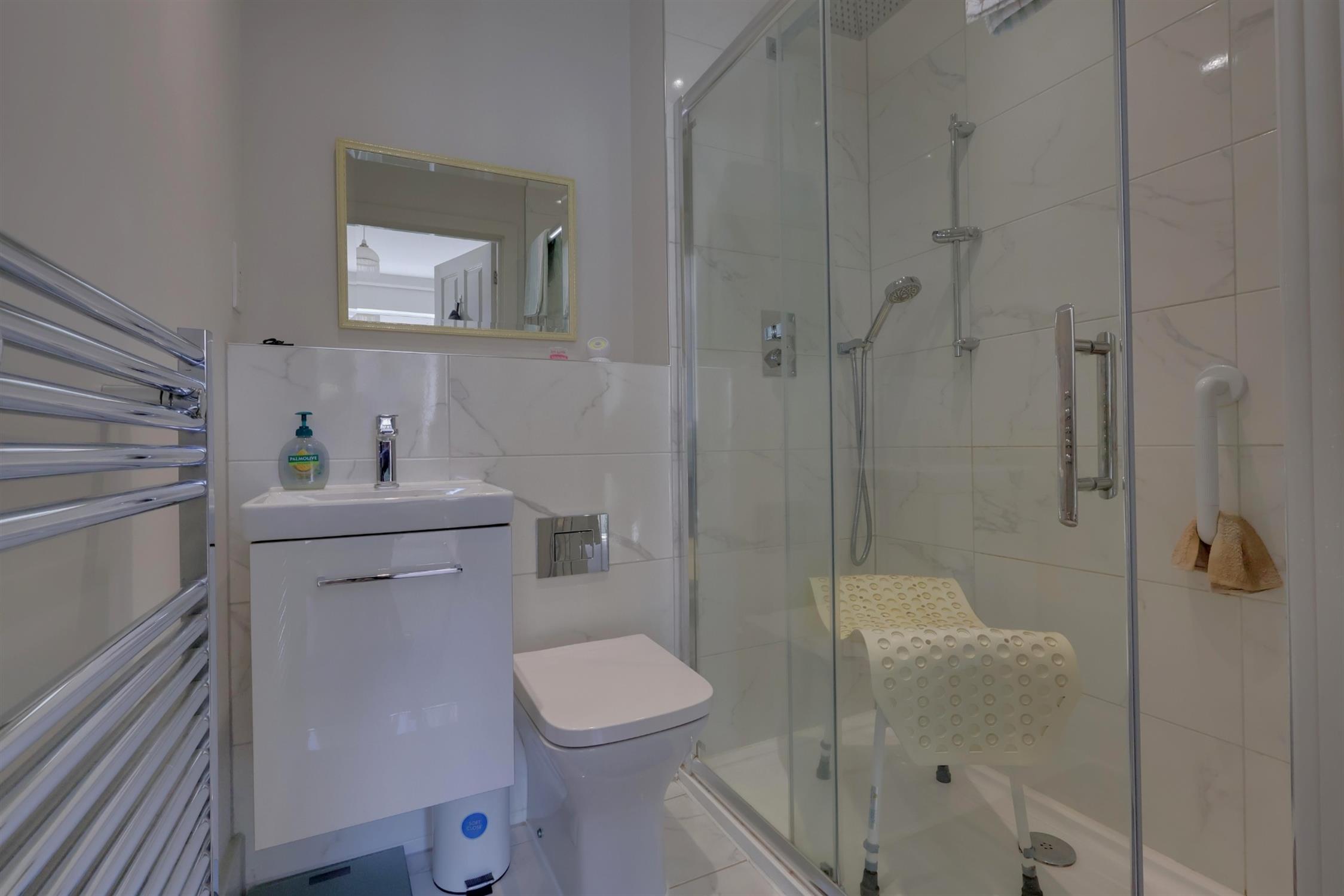 Walk-in shower cubicle. WC. Ceramic sink with cupboard under. Heated towel rail.