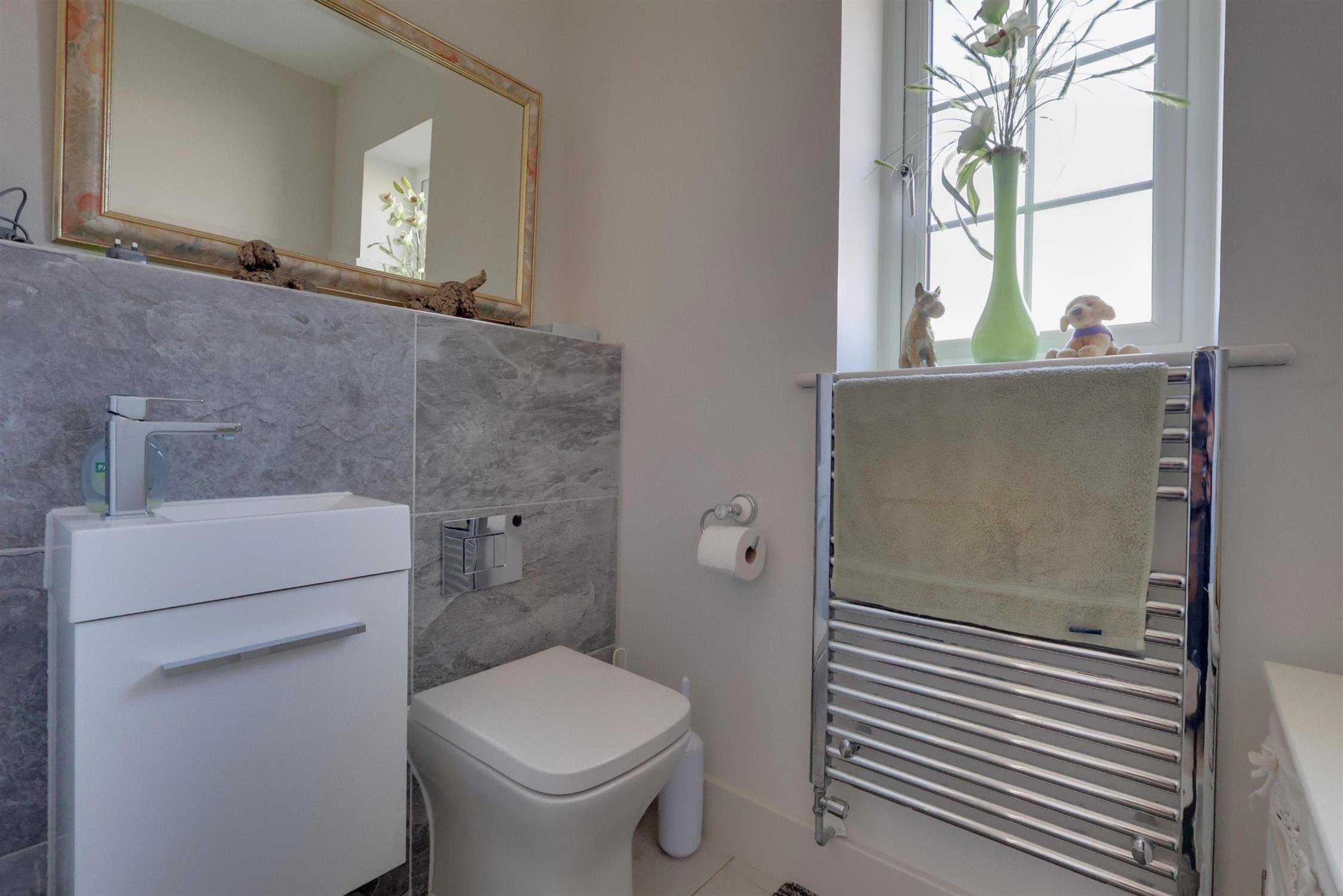 WC. Ceramic sink with cupboard under. Heated towel rail. Frosted double glazed window.