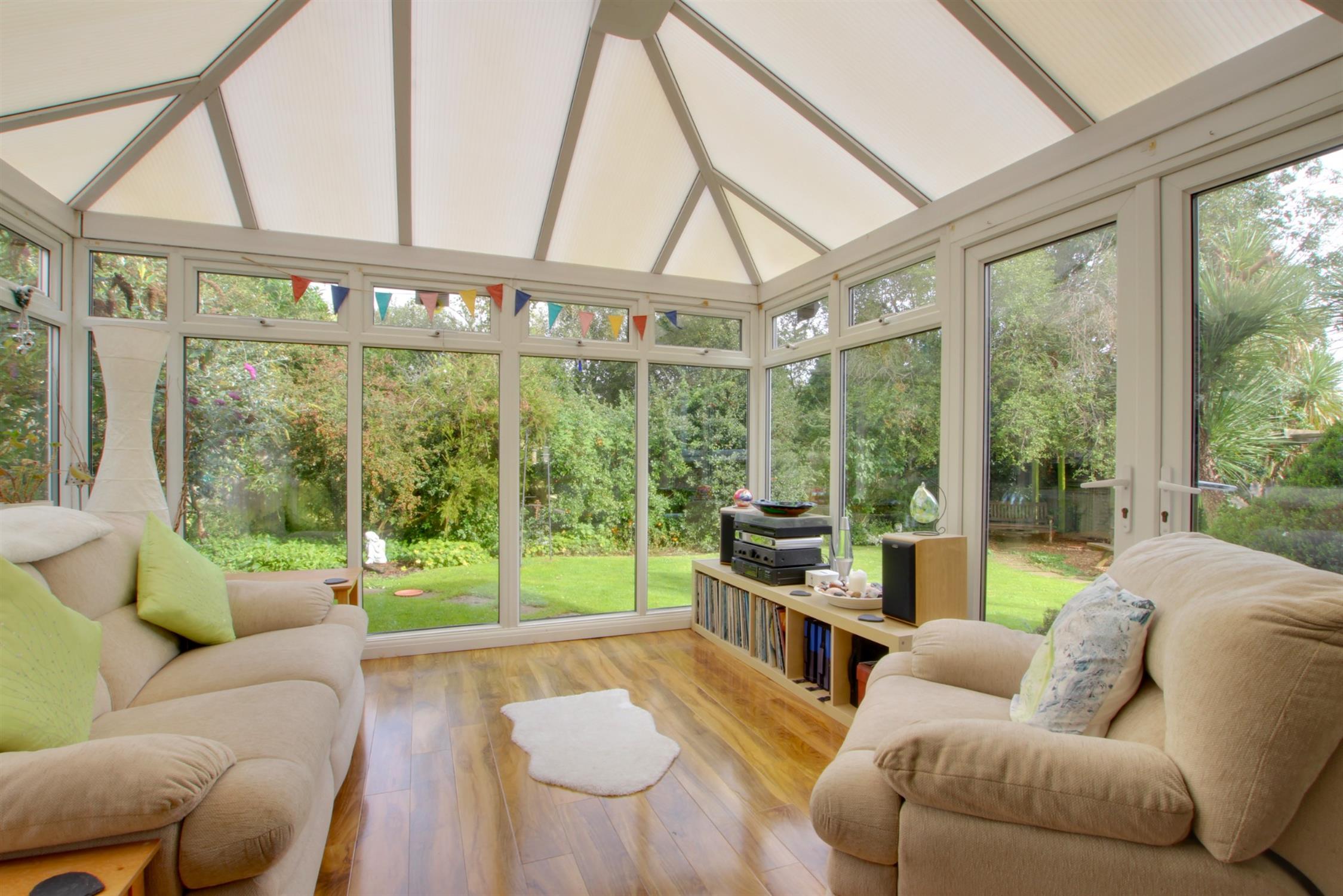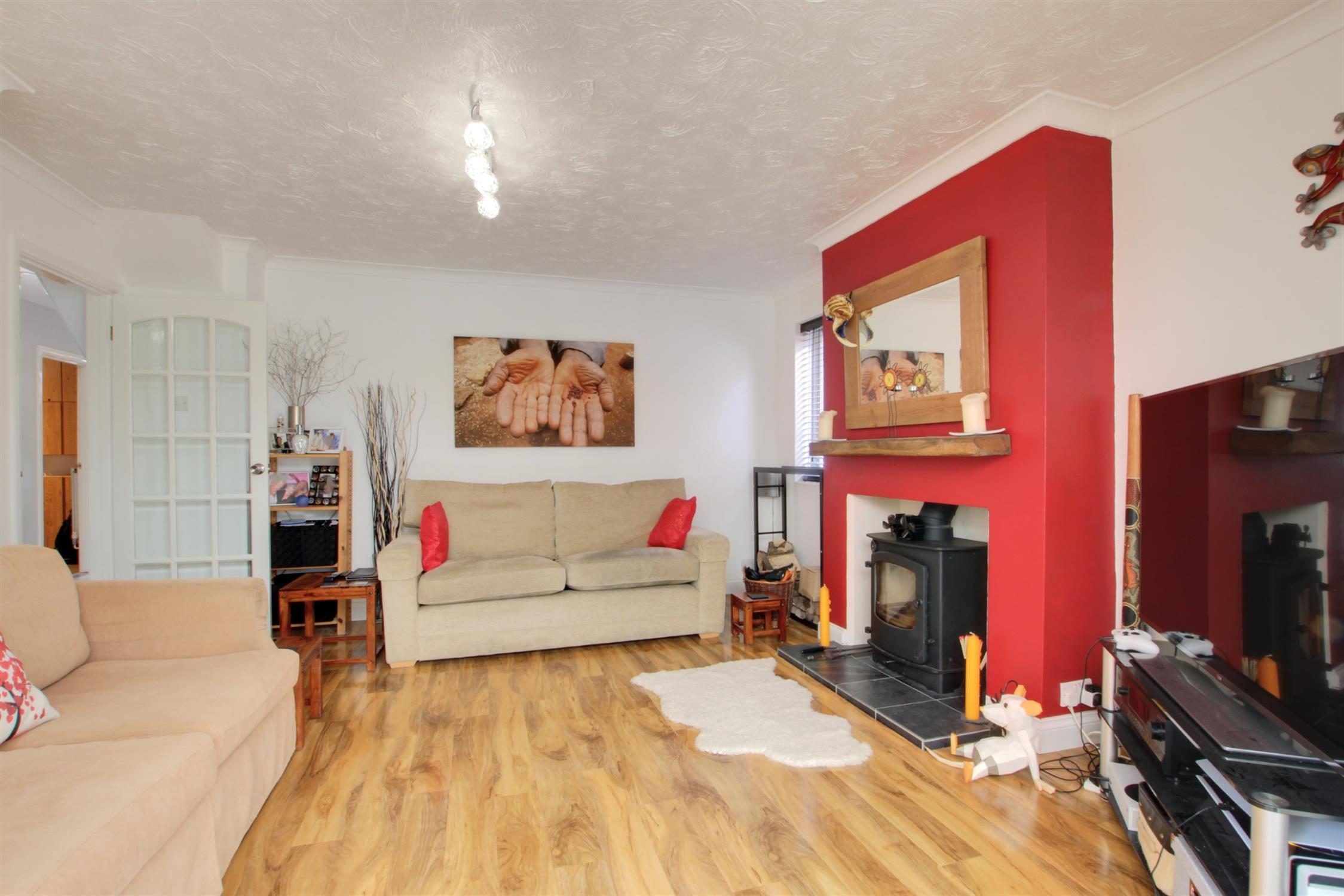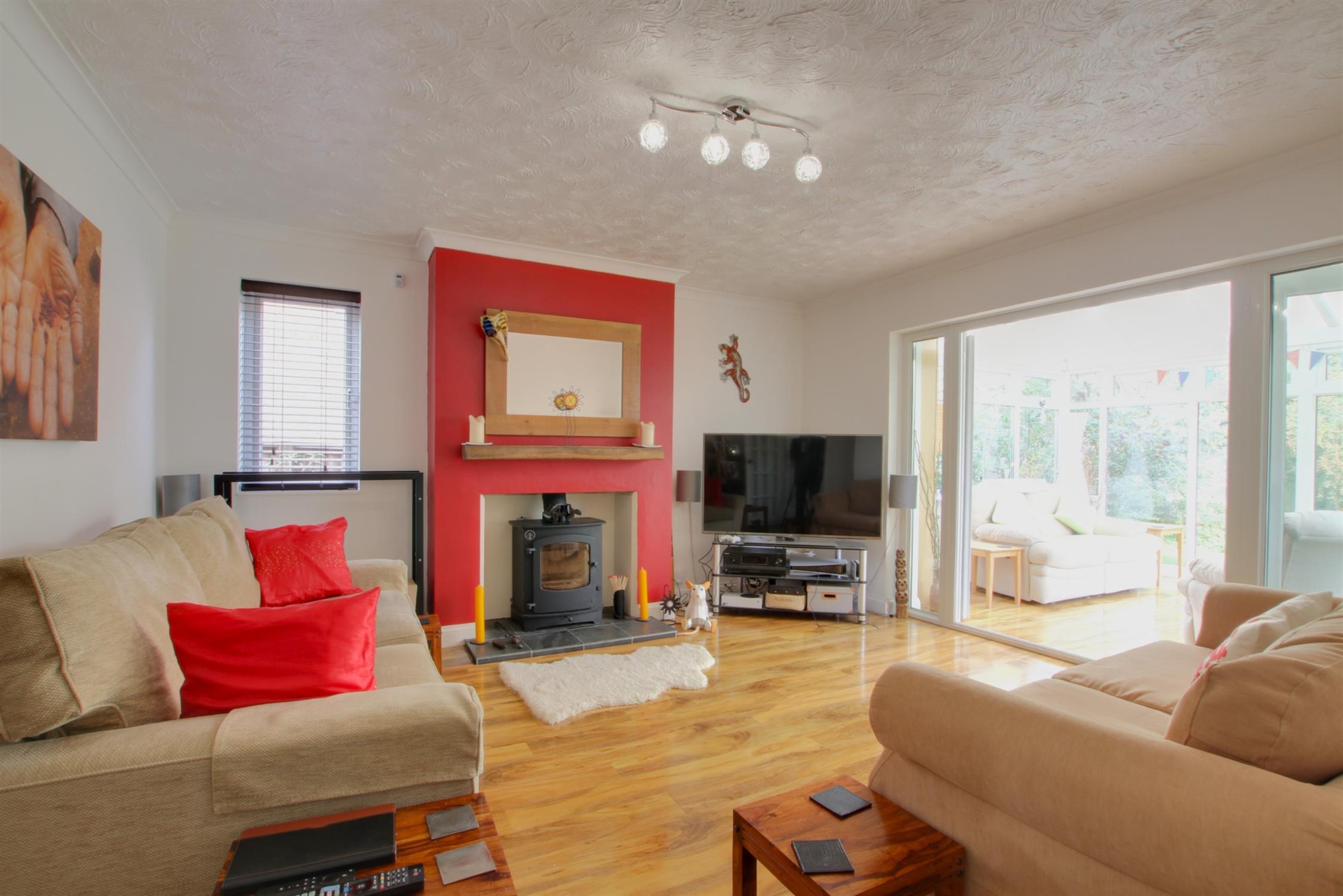 Lounge, with an operational log burner, small UPVC window out to the side of the property and doors leading to the conservatory.