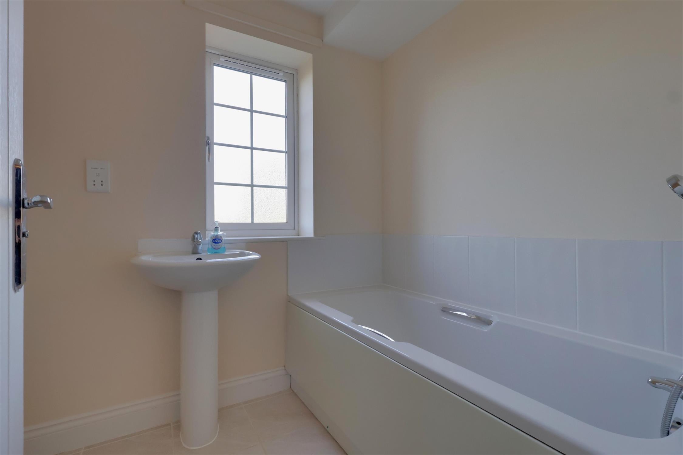 Panelled bath with shower attachment. WC. Ceramic sink. Radiator. Frosted double glazed window.