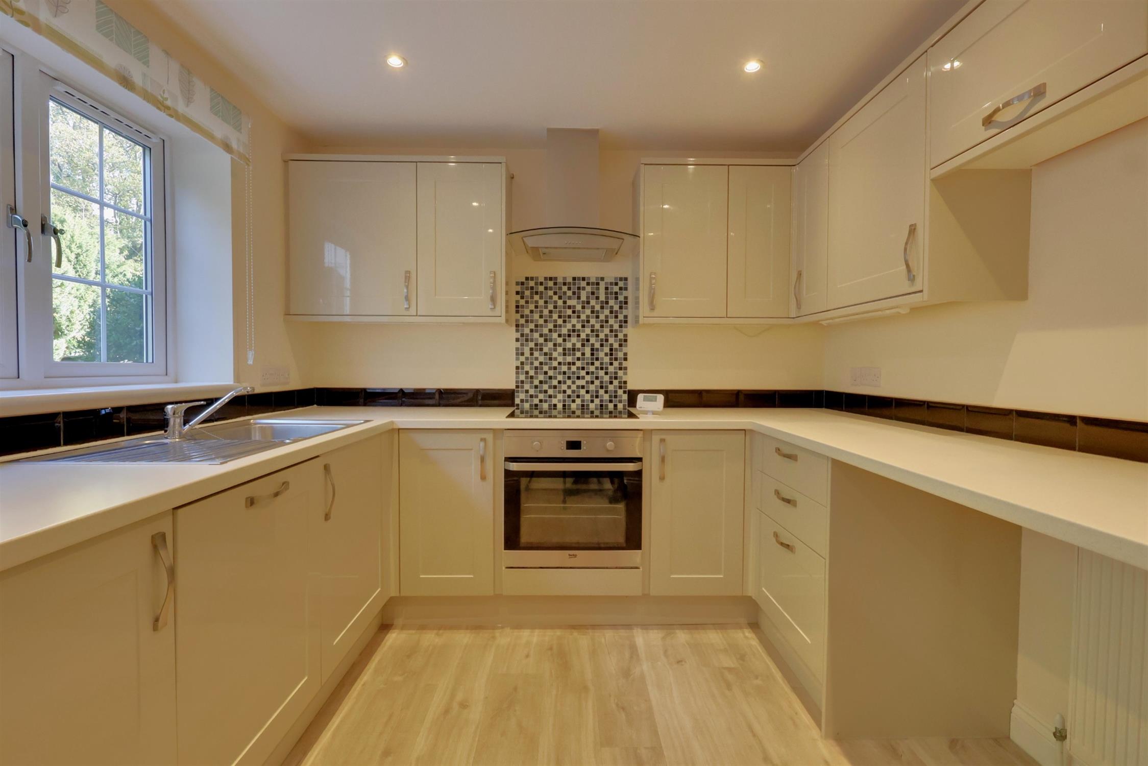 A range of wall and base cupboards with work surface over. Stainless steel sink with drainer. Four ring halogen hob with extractor fan over. Integrated fridge, freezer, washing machine, dishwasher and oven. Radiator. Two double glazed windows.