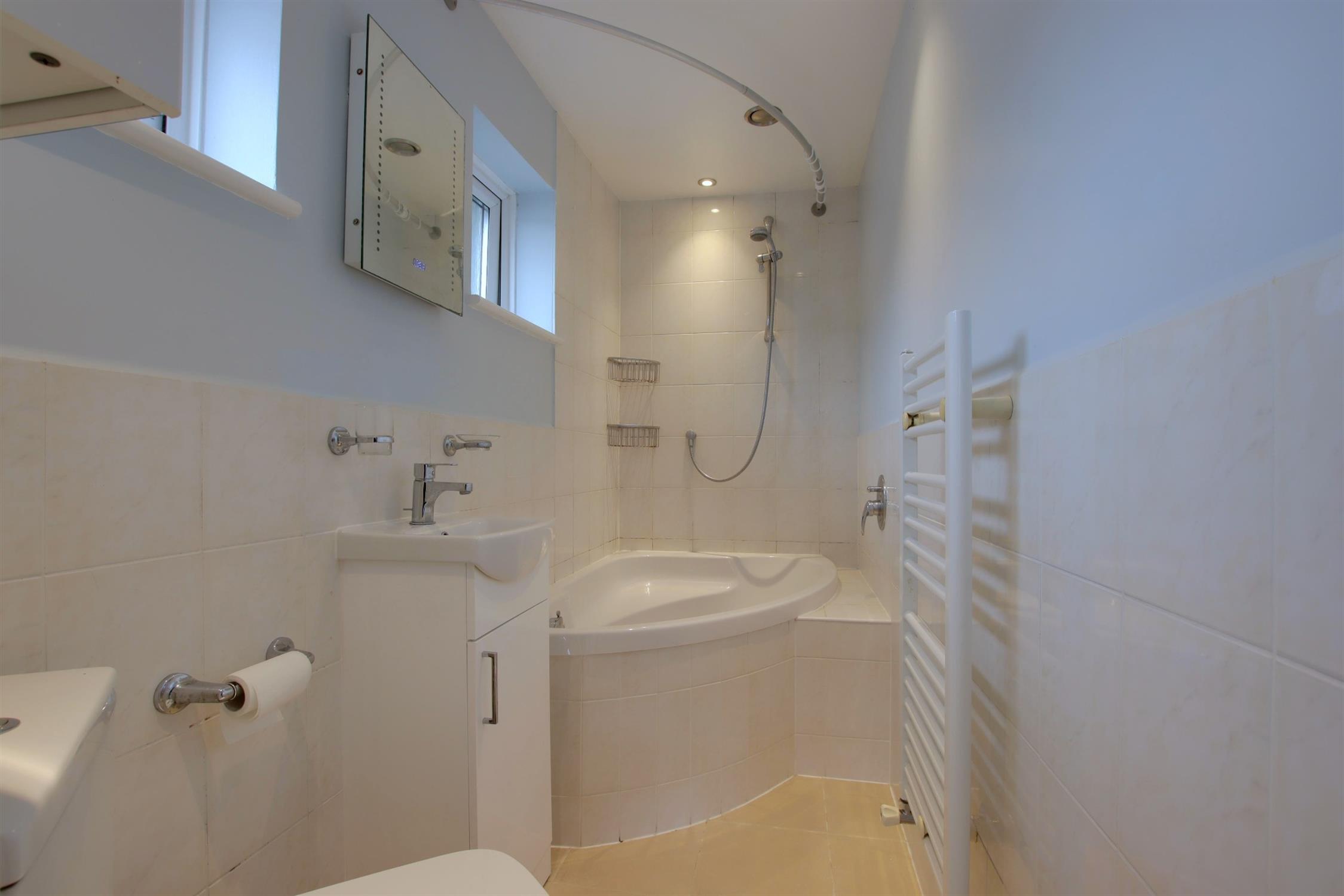 Double glazed window to the rear aspect. Suite comprising; bath with shower over and rail. Wash hand basin. Concealed low level WC. Heated towel rail. Part tiled walls.