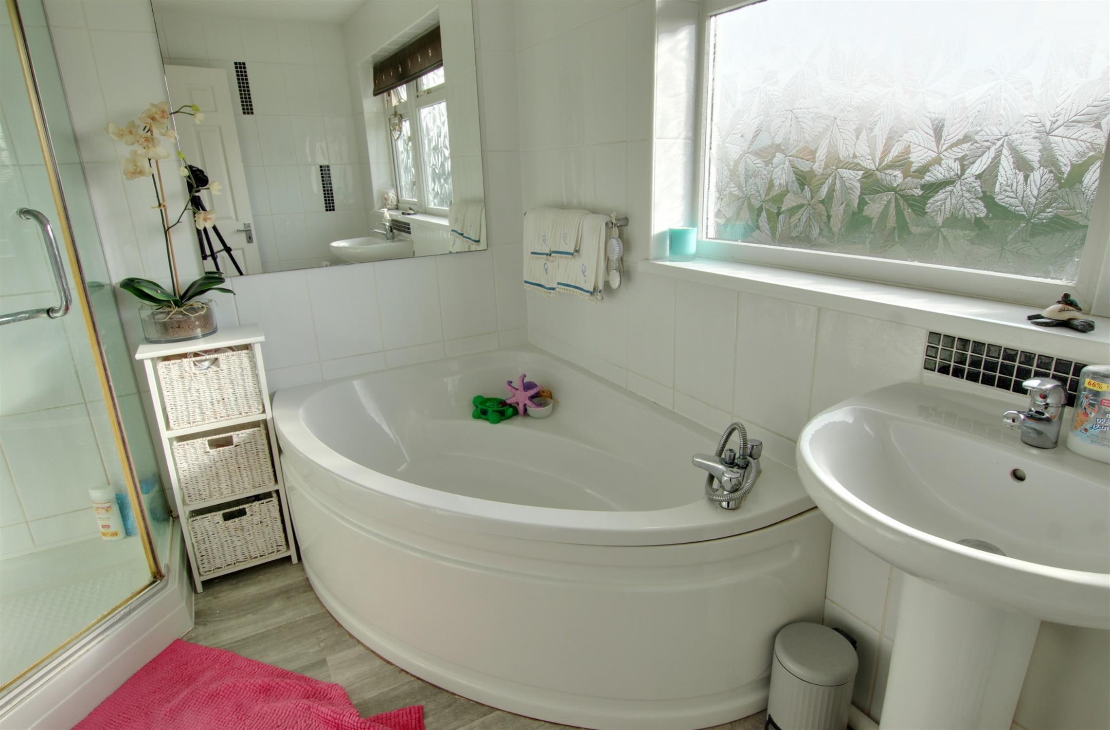 2 windows to rear. Corner bath. Low level WC. Pedestol wash hand basin. Corner shower unit. Complementary tiling. Radiator.