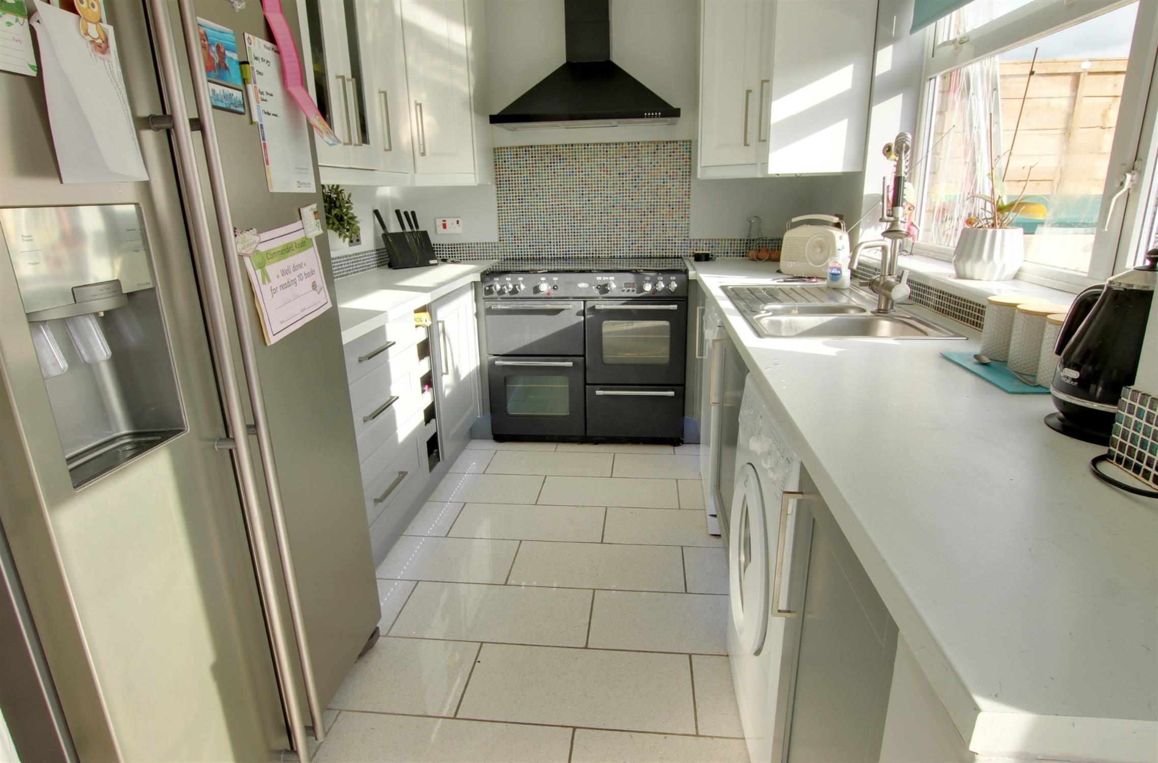 Window to rear. Range of wall and base units with working surfaces over. One and a half bowl stainless steel sink unit. Tiled splashbacks. Range style cooker. Space and plumbing for washing machine, tumble dryer and dishwasher. Space for American fridge freezer. Breakfast bar. Concealed lighting. Radiator. Double doors to garden.