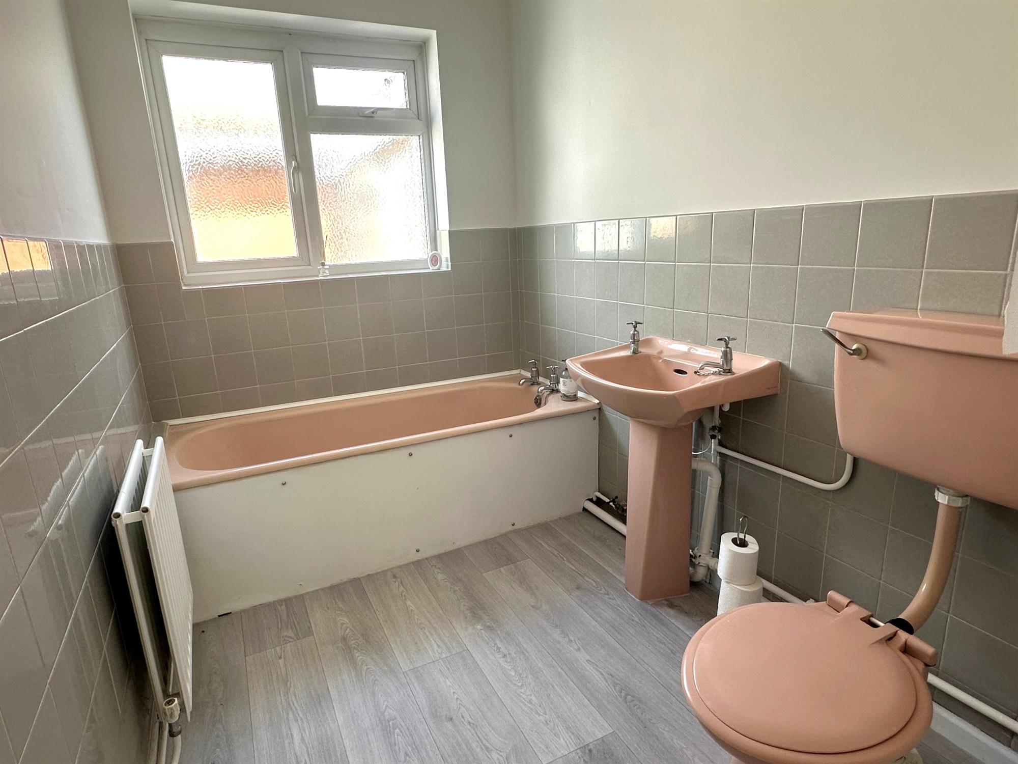 Obscure double glazed window to side aspect. Suite comprising of panelled bath, pedestal wash hand basin, WC, complementary tiling and wood effect vinyl flooring. Radiator.