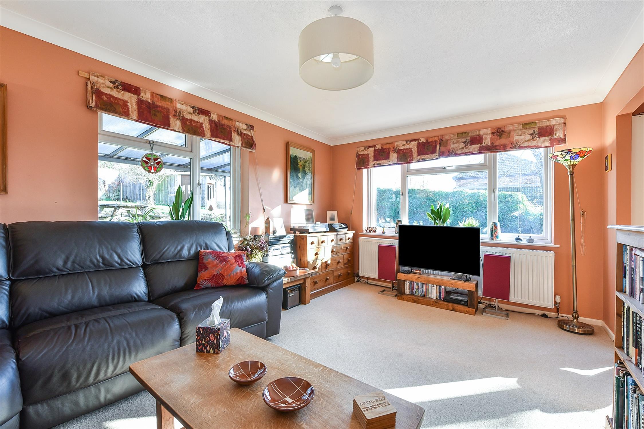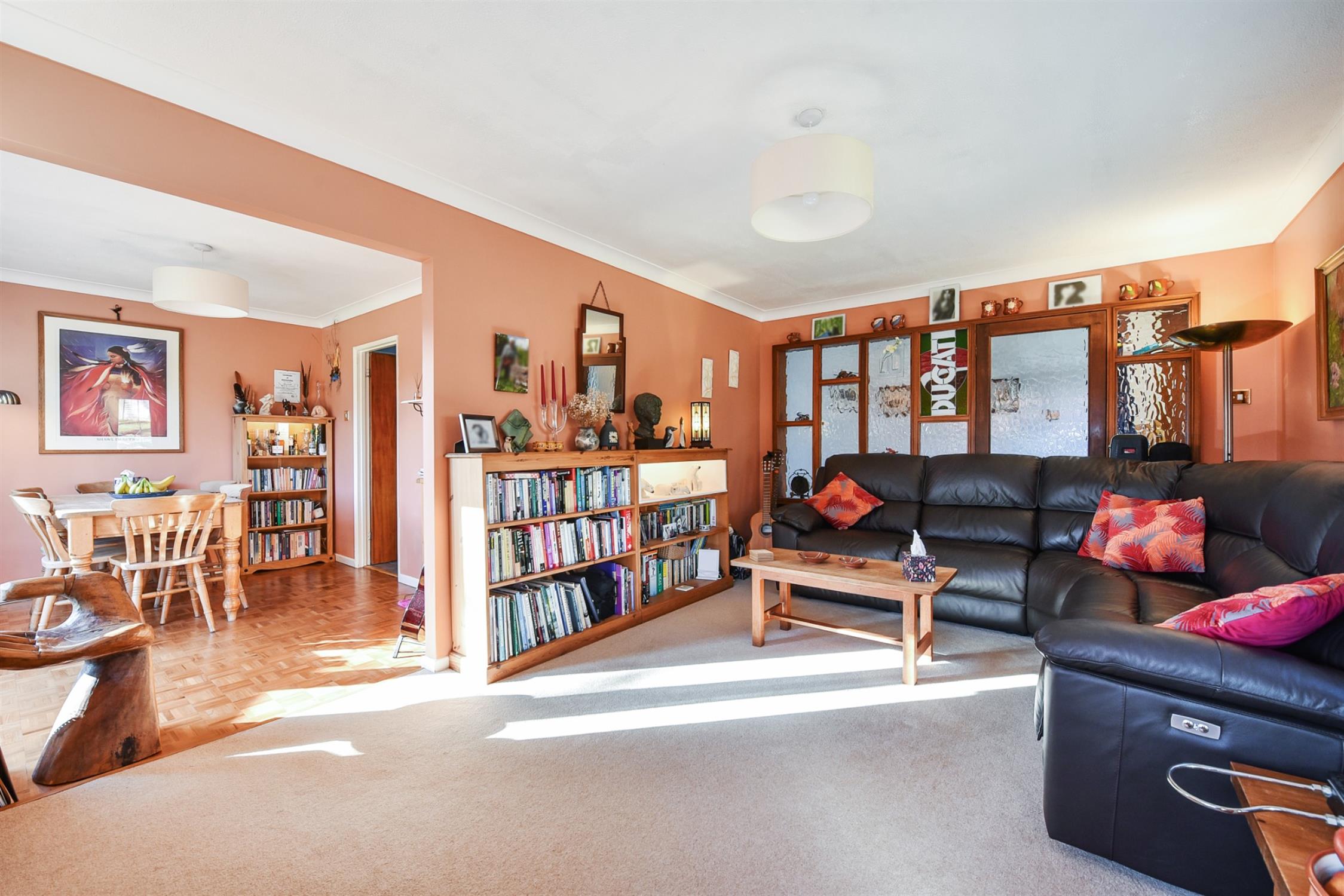 A great space, with attractive wall to the hall patchwork framed with dapple-glass. Large double aspect windows overlooking warp-around garden.