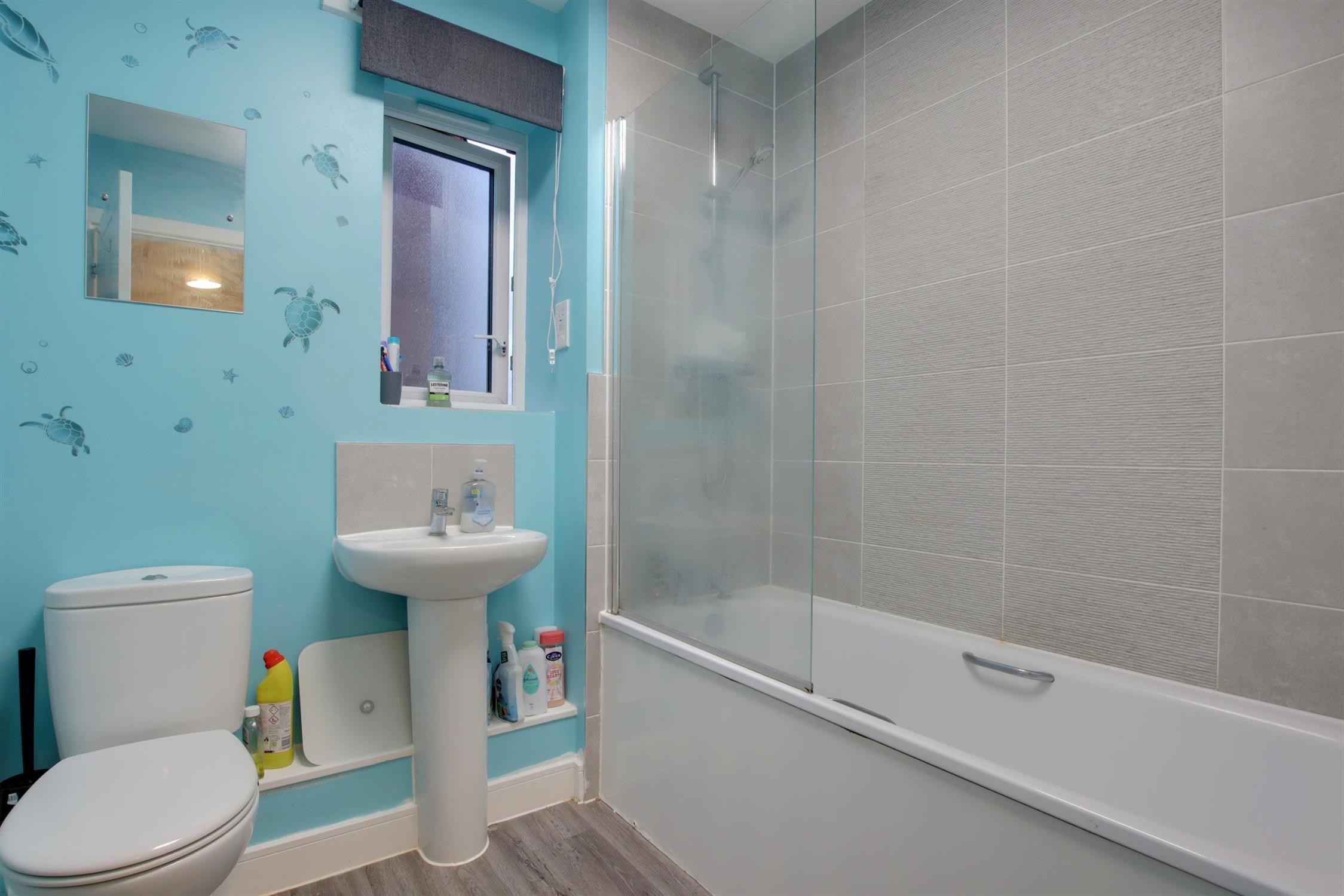 Double glazed window to the side aspect. Smooth ceiling. Extractor fan. Suite comprising; bath with shower over and screen. Wash hand basin. Low level WC. Heated towel rail. Part tiled walls.
