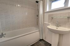 Panel bath. Pedestal wash basin with mixer taps. Part tiled walls. Radiator. Obscured double-glazed window to rear elevation.