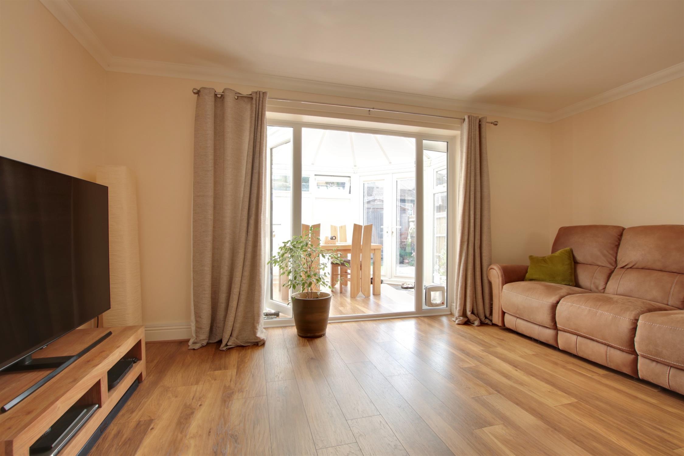 An 'L' shaped room with double glazed French doors leading to conservatory. Laminate flooring. Radiator.
