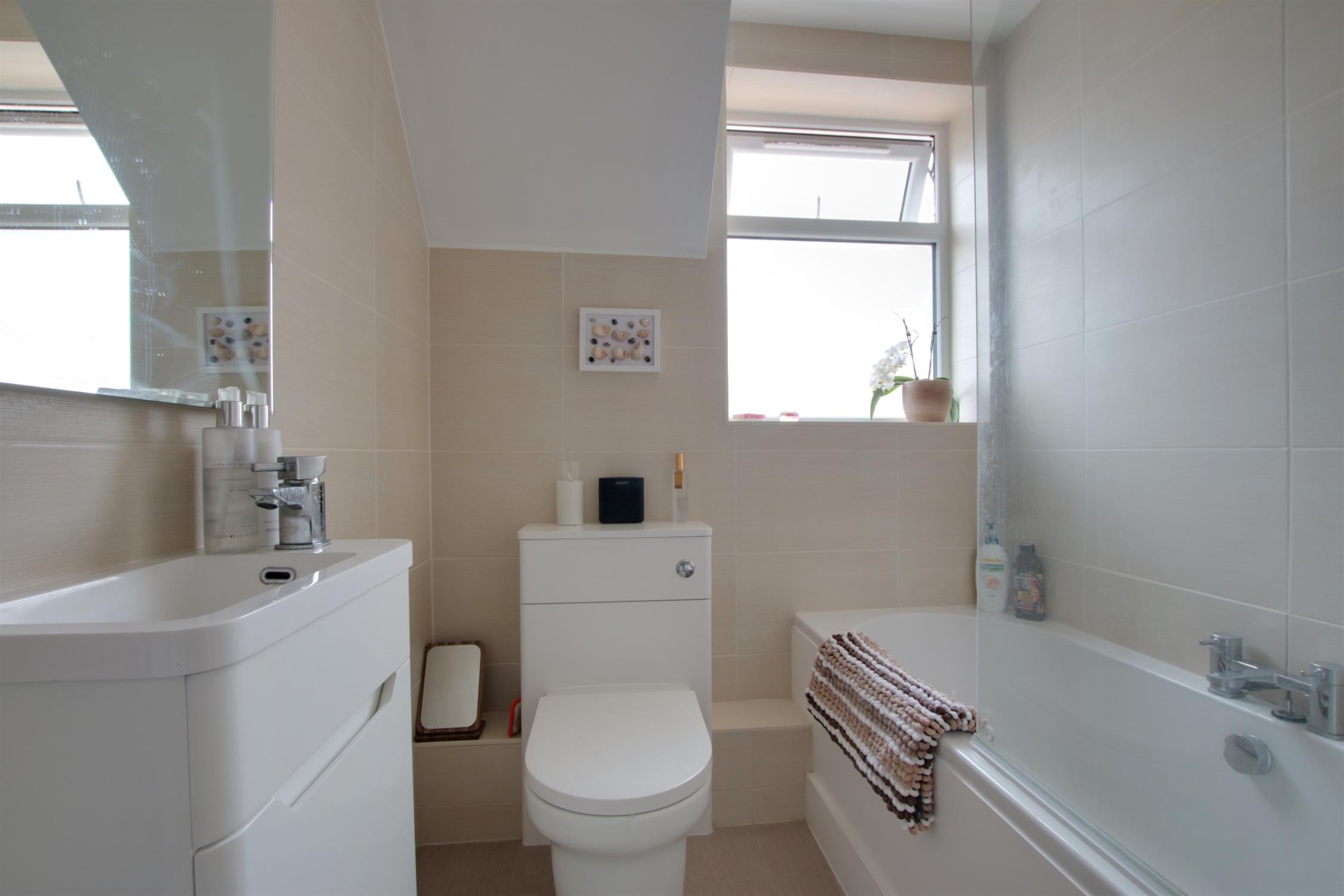 Double glazed window to side elevation. Re-fitted bathroom comprising; panel enclosed bath with shower unit over with monsoon shower head and shower screen. Low level close coupled WC. Vanity unit with wash hand basin and storage beneath. Tiled floor and walls. Extractor fan.