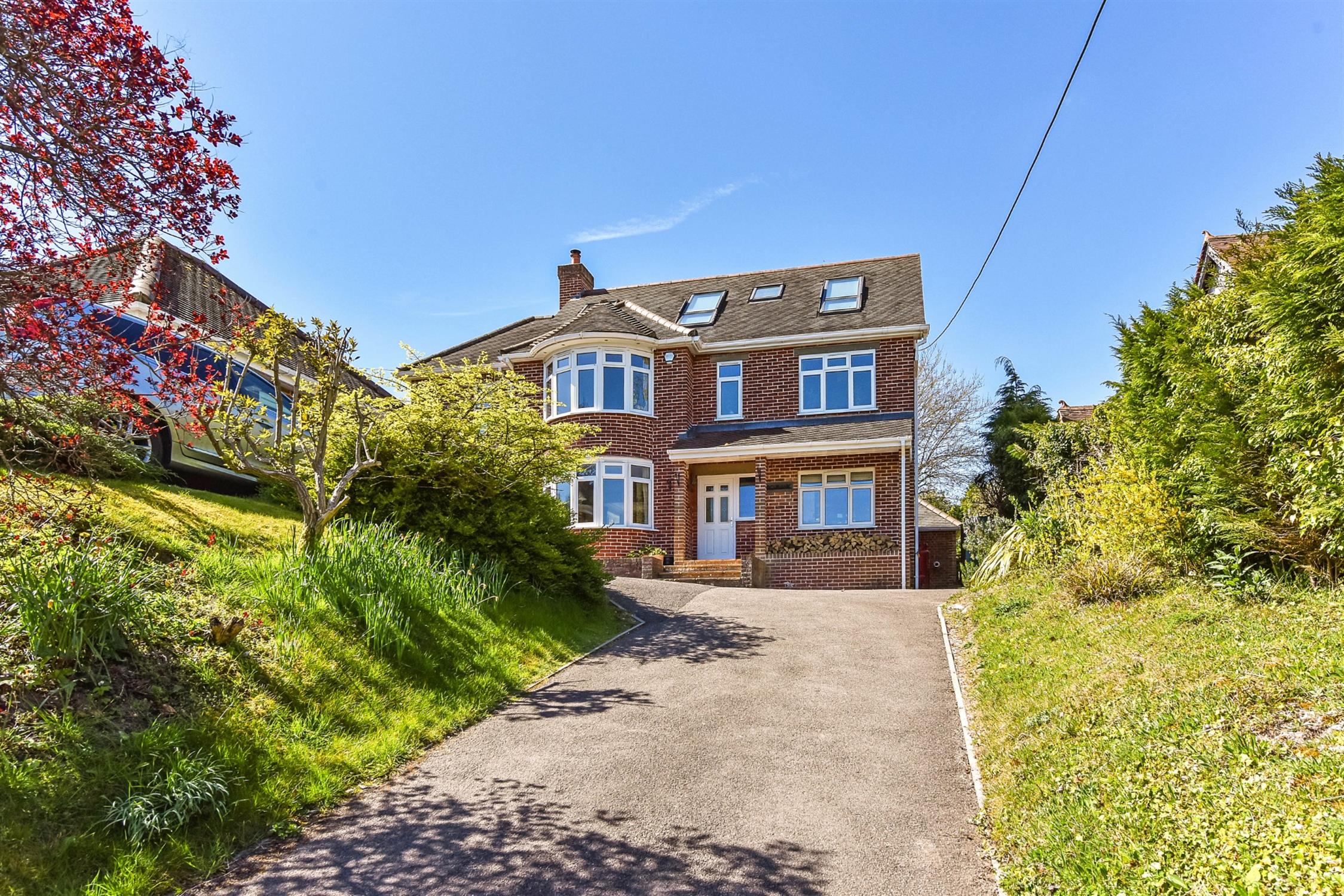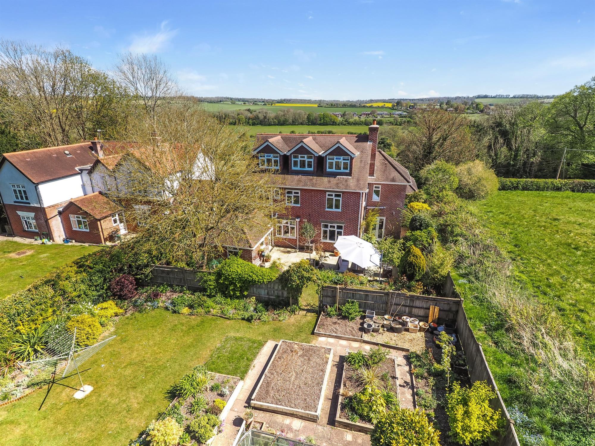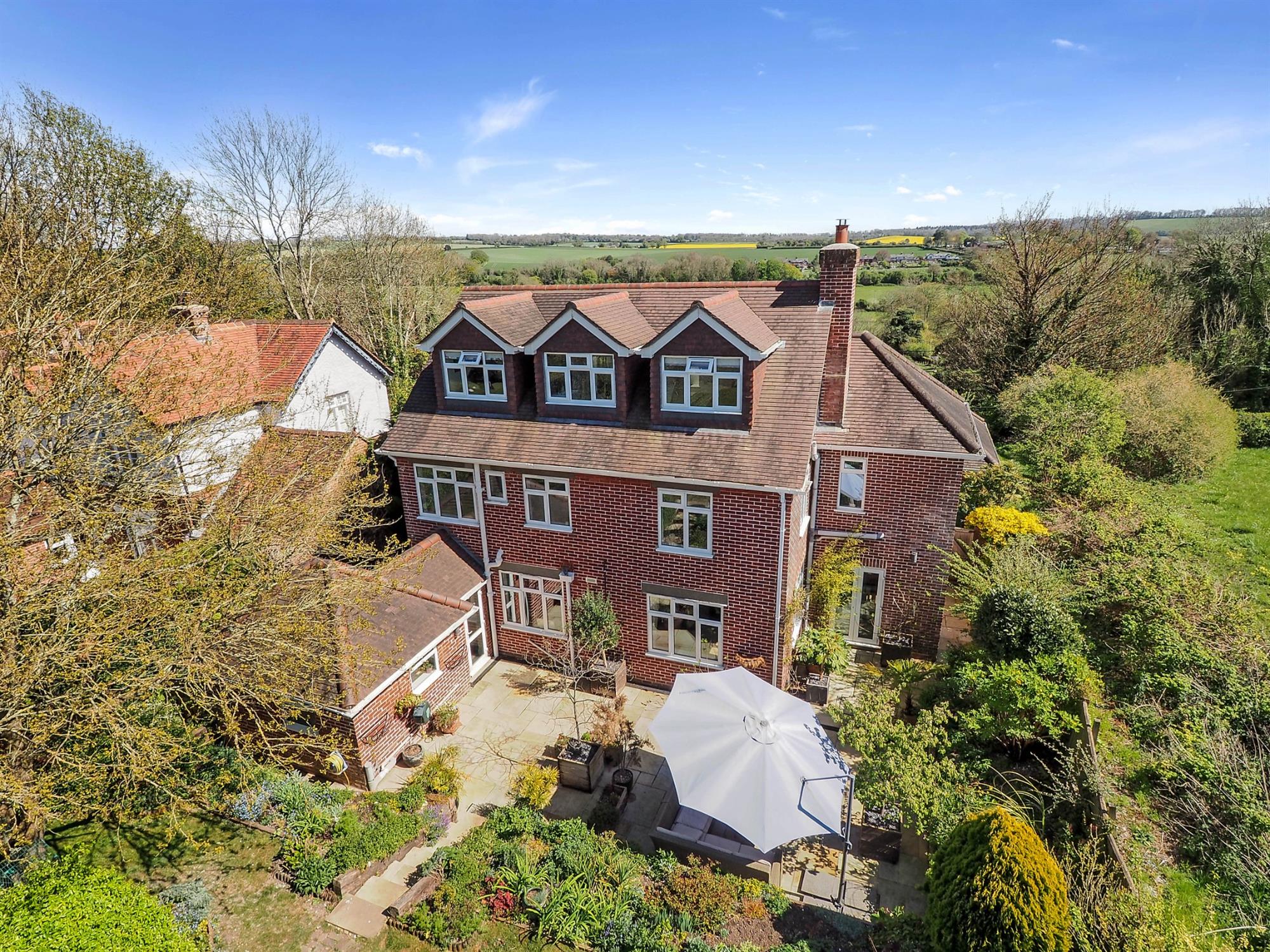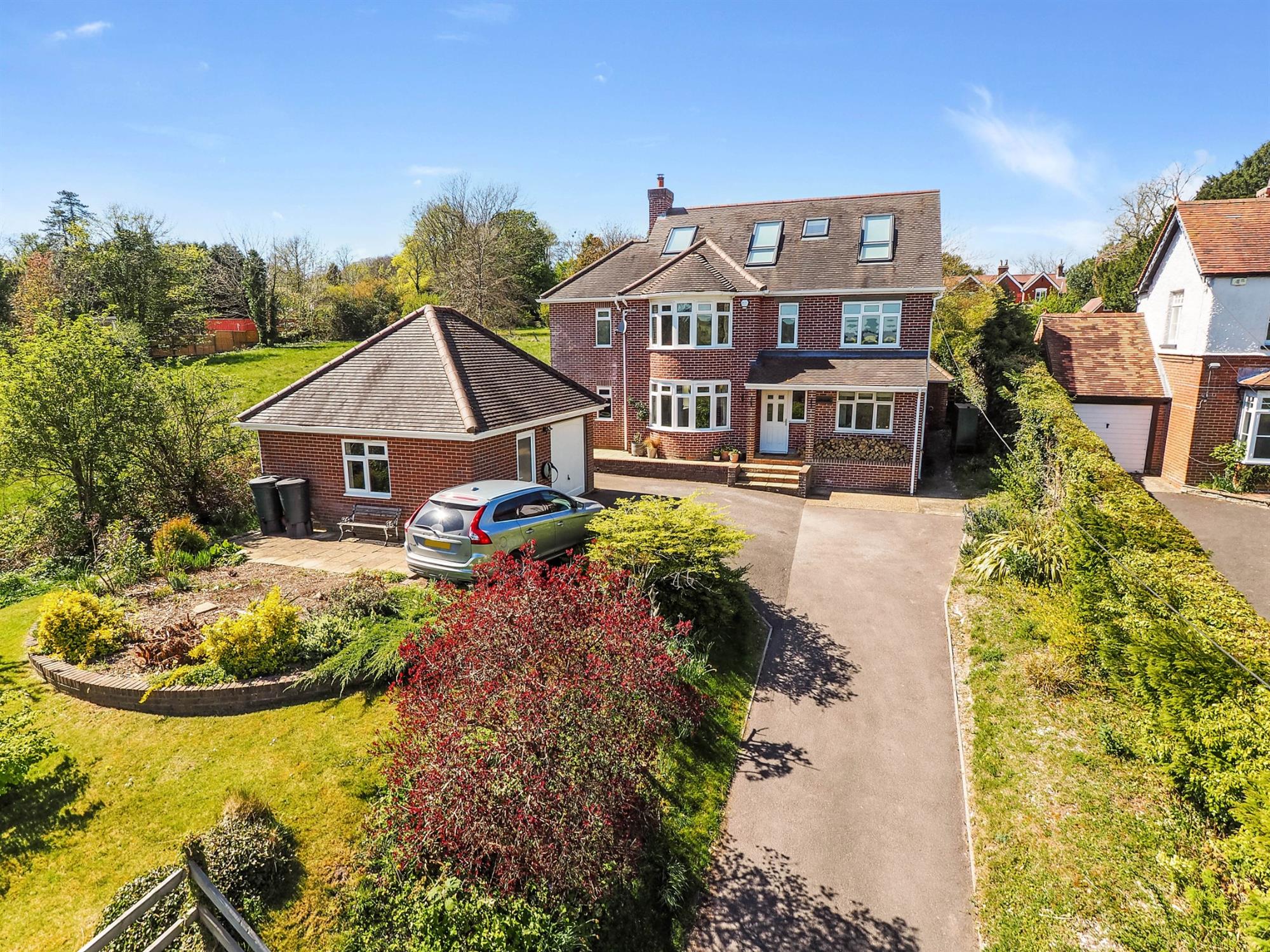 Impressive detached family residence, positioned on the edge of the village of Droxford. Set within approximately 0.24 acre of landscaped gardens, this exceptional home enjoys breathtaking panoramic views across the Meon Valley. Thoughtfully extended and tastefully updated, the property offers spacious, flexible accommodation arranged over three floors. The first and second floors comprise six bedrooms and three well-appointed bathrooms, ideal for family living and guests alike.