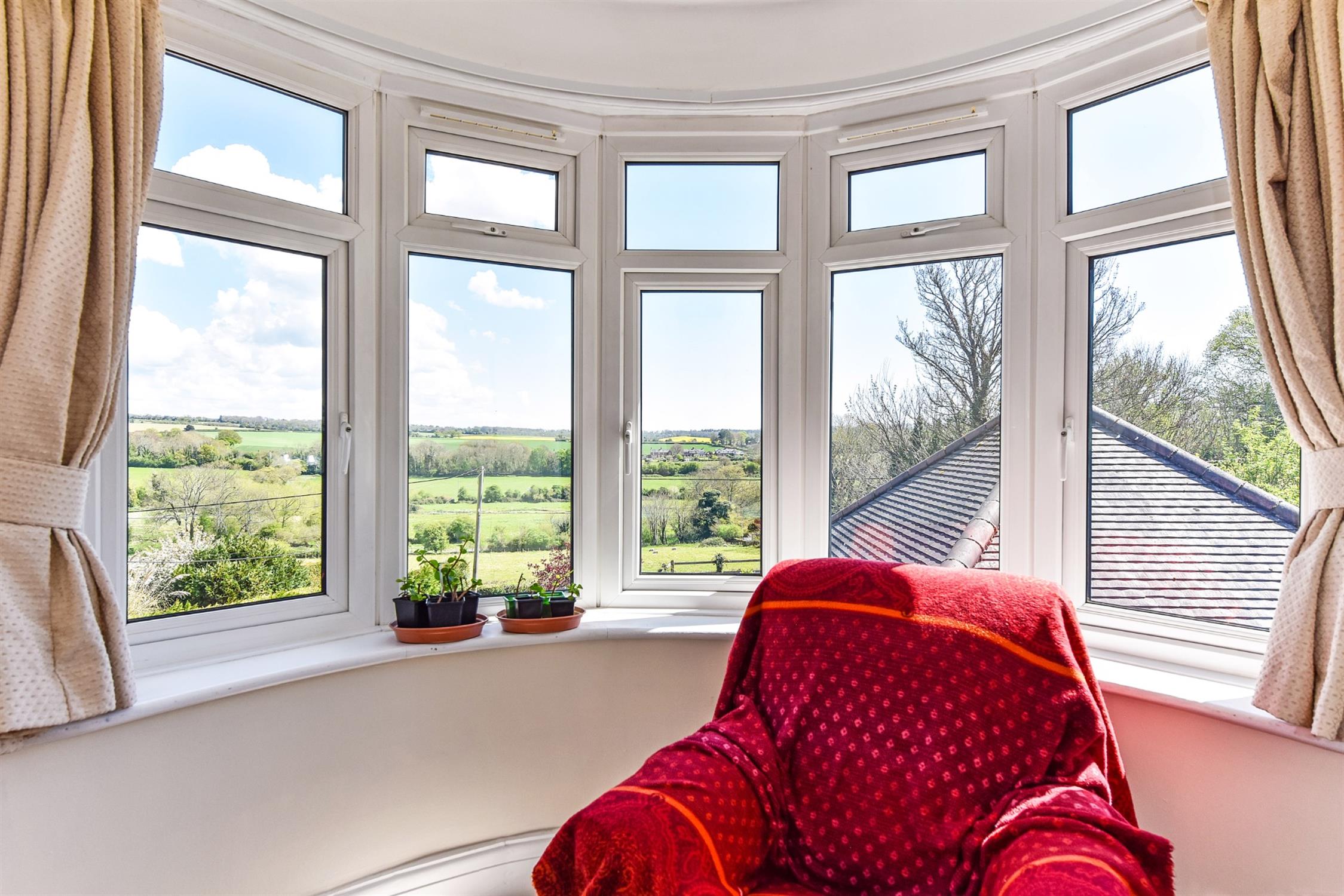 Fabulous, light and spacious, triple-aspect room with amazing views through the double glazed bay window, two further double glazed windows to the side and rear aspects. Fireplace with tiled hearth and fitted wood burning stove. Radiators.