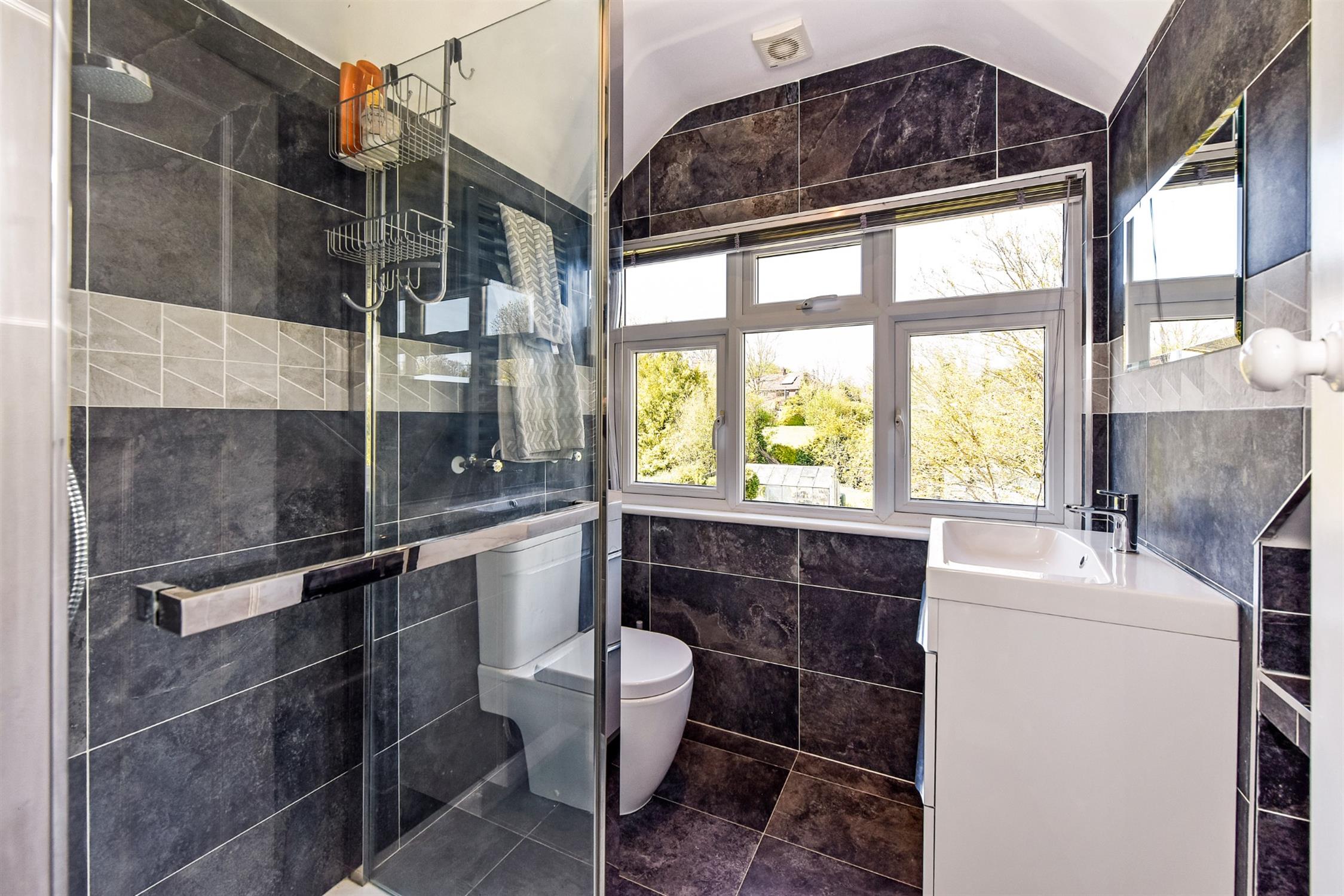 Fitted suite comprising shower cubicle with rainfall and hand-held attachments, WC and a wash hand basin with two storage drawers beneath. Tiling and inset lighting. Heated towel rail. Double glazed window to the rear aspect.