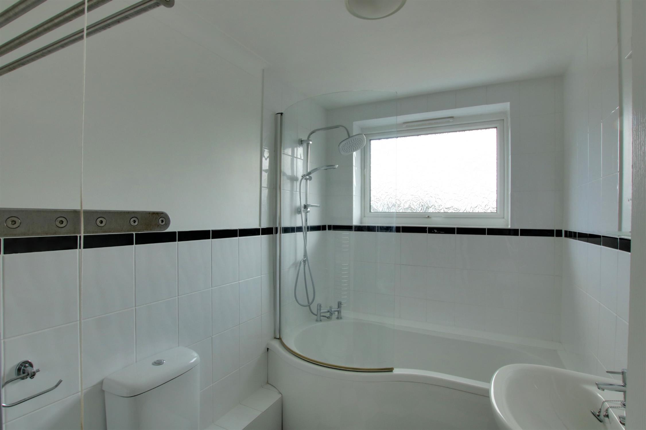 BATHROOM: White suite comprising P shaped bath with shower attachment and screen over. Low level WC. Pedestal wash hand basin. Tiled floor. Heated towel rail and double glazed window to the rear aspect.