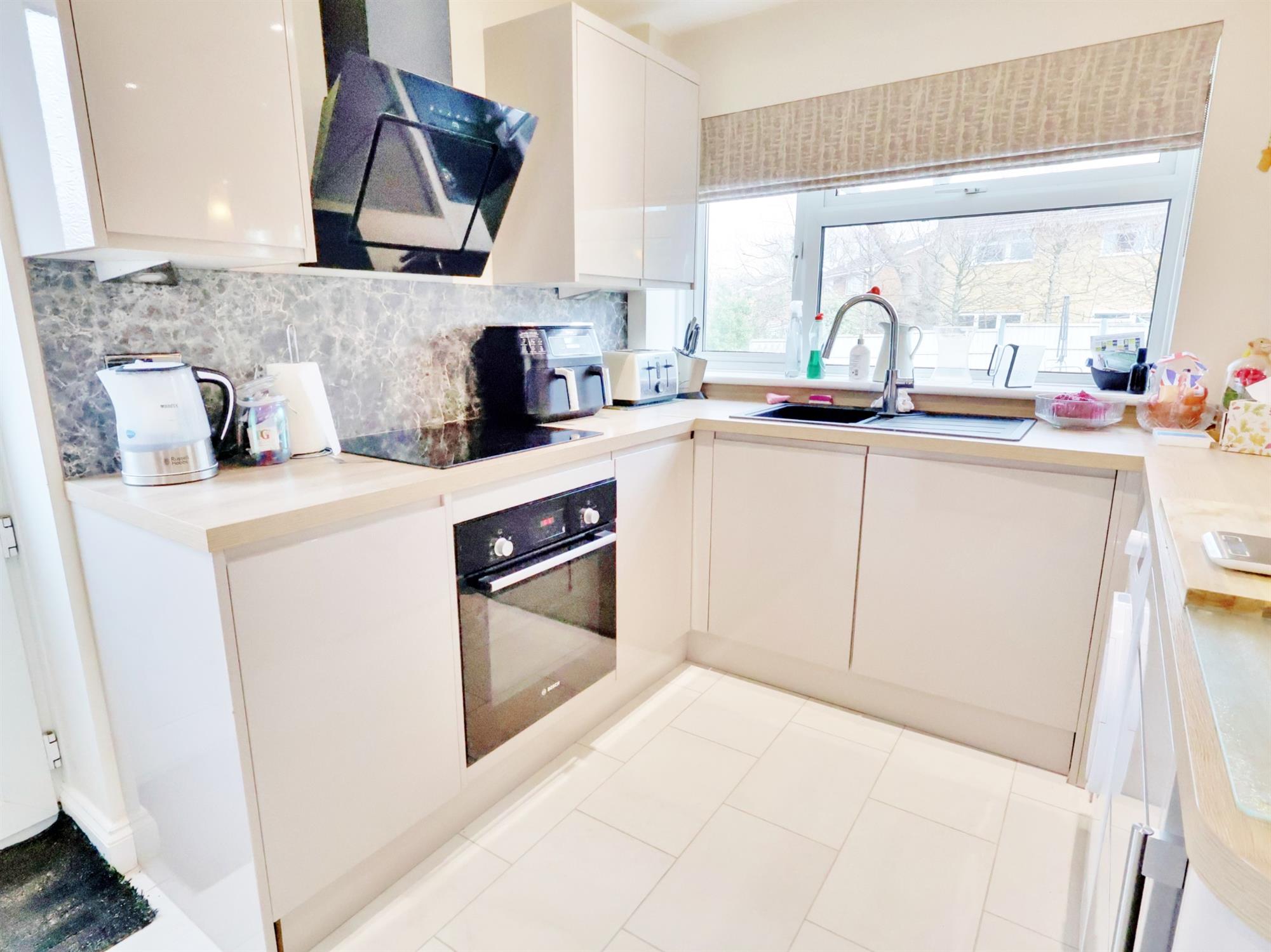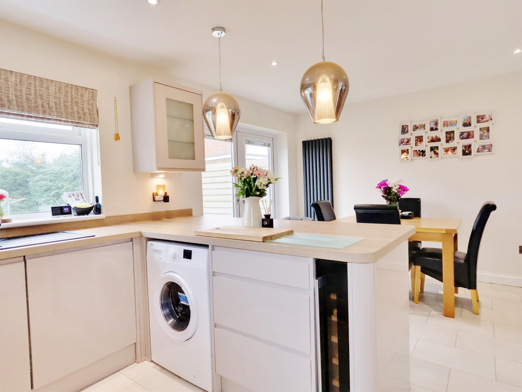 Window to rear. Range of contemporary wall and base units with working surfaces over. Inset sink with drainer and mixer tap. Four-ring induction hob with extractor over. Built-in electric oven. Integrated dishwasher. Space and plumbing for washing machine. Space for fridge freezer. Door to side. Double-opening doors to garden. Vertical radiator.