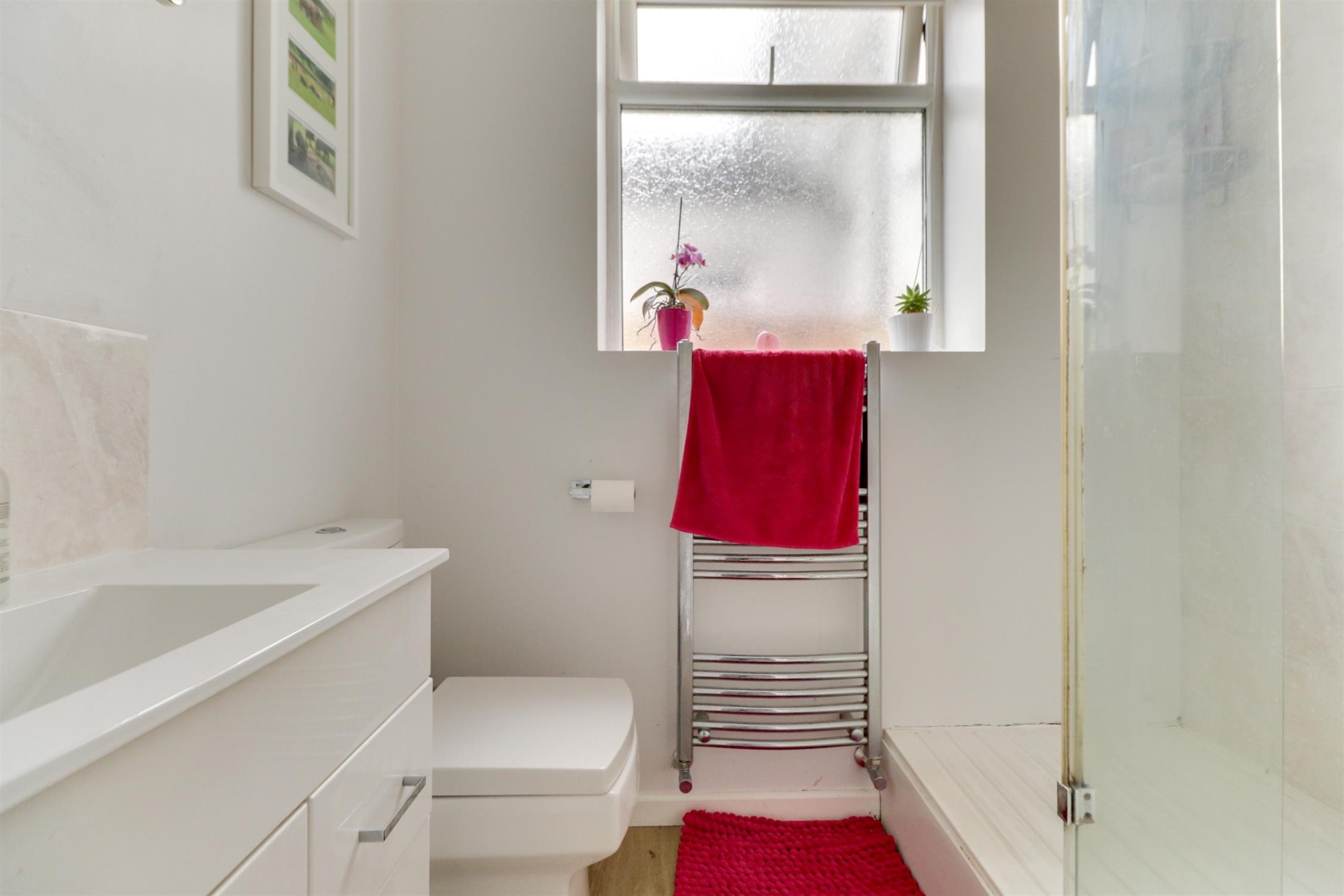 Smooth ceiling, double glazed obscured window, extractor fan, large shower enclosure, low level WC, wash hand basin, part tiled walls, tiled floor.